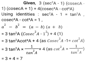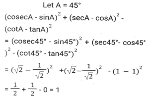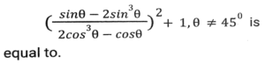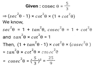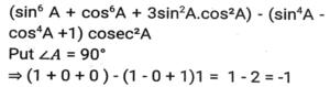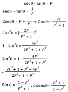Trigonometry (Part-2)Total Questions: 5031. If secθ - tanθ = P, then cosecθ = ? [SSC CGL 04/06/2019 (Evening)](a)(b)(c)(d)Correct Answer: (c)Solution:32. If 0⁰ < θ < 90⁰ and cos²θ = 3 (cot²θ - cos²θ) then the value of (1/2 secθ + sinθ)⁻¹ is: [SSC CGL 04/06/2019 (Afternoon)](a) √3 + 2(b) 2(2 - √3)(c) 2(√3 - 1)(d) √3 + 1Correct Answer: (b) 2(2 - √3)Solution:33. Solve it- [SSC CGL 04/06/2019 (Afternoon)](a) cosec²θ(b) sec²θ(c) cot²θ(d) 2tan²θCorrect Answer: (b) sec²θSolution:34. (cosecA - sinA)² + (secA - cosA)² - (cotA - tanA)² is equal to: [SSC CPO 16/03/2019 (Evening)](a) 2(b) 0(c) 1(d) -1Correct Answer: (c) 1Solution:35. Find the value of- [SSC CPO 15/03/2019 (Evening)](a) cosec A(b) cos A(c) sec A(d) sin ACorrect Answer: (c) sec ASolution:36. Find the value of (sin⁶ A + cos⁶ A + 3sin²A. cos²A) - (sin⁴A - cos⁴A + 1) cosec²A. [SSC CHSL Tier II (18/11/2024)](a) 3(b) -3(c) 0(d) -1Correct Answer: (d) -1Solution:37. Find the value of 3 (sec²A - 1) (cosecA - 1) (cosecA + 1) + 4(cosec²A - cot²A). [SSC CHSL Tier II (18/11/2024)](a) 12(b) 3(c) 10(d) 7Correct Answer: (d) 7Solution:38. The value of sin²30⁰ - sin²40⁰ + sin²45⁰ - sin²55⁰ - sin²35⁰ + sin²45⁰ - sin²50⁰ + sin²60⁰ is : [SSC CGL 09/09/2024 (1st Shift)](a) 1(b) 2(c) 4(d) 0Correct Answer: (d) 0Solution:39. The value of cos²29⁰ + cos²61⁰ is : [SSC CGL 09/09/2024 (1st Shift)](a) √3/2(b) 2(c) 1(d) 0Correct Answer: (c) 1Solution:40. If cosec θ = 5/3, then evaluate (sec² θ -1) × cot² θ × (1+ cot² θ) [SSC CGL 09/09/2024 (1st Shift)](a) 25/16(b) 9/16(c) 25/9(d) 4/5Correct Answer: (c) 25/9Solution:Submit Quiz« Previous12345Next »
