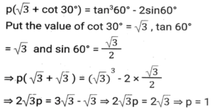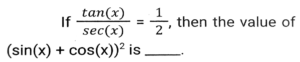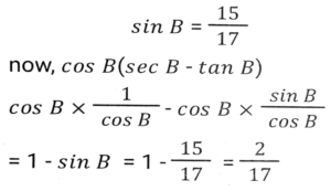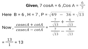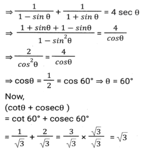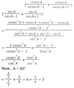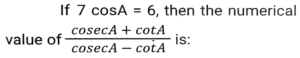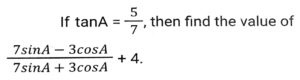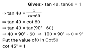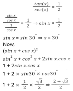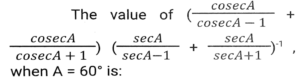 Trigonometry (Part-3)Total Questions: 5011. If tan4θ. tan6θ = 1, where 6θ is an acute angle, then find the value of Cot5θ. [SSC CGL 12/09/2024 (3rd Shift)](a) √3(b) -√3(c) -1(d) 1Correct Answer: (d) 1Solution:12. Simplify [SSC CGL 12/09/2024 (3rd Shift)](a) 1(b) 0(c) 13(d) -13Correct Answer: (c) 13Solution:13. If p(√3 + cot 30ᵒ) = tan³60ᵒ - 2sin60ᵒ, then the value of p is: [SSC CGL 13/09/2024 (1st Shift)](a) -1(b) 2√3(c) 1(d) √3Correct Answer: (c) 1Solution:14. Simplify [SSC CGL 13/09/2024 (1st Shift)](a) √3(b) √6(c) √2(d) √5Correct Answer: (a) √3Solution:15. If sin31ᵒ = ∝, then the value of cot 59ᵒ is: [SSC CGL 13/09/2024 (1st Shift)](a)(b)(c)(d)Correct Answer: (b)Solution:16. Simplify [SSC CGL 13/09/2024 (2nd Shift)](a)(b)(c)(d)Correct Answer: (b)Solution:17. Simplify [SSC CGL 13/09/2024 (2nd Shift)](a)(b)(c)(d)Correct Answer: (a)Solution:18. If sinB = 15/17, what is value of cosB (secB - tanB) ? Given that 0 < B < π/2 [SSC CGL 13/09/2024 (2nd Shift)](a) 1/16(b) 2/15(c) 8/15(d) 2/17Correct Answer: (d) 2/17Solution:19. Simplify [SSC CGL 13/09/2024 (3rd Shift)](a) 4(b) 3(c) 1(d) 2Correct Answer: (b) 3Solution:20. In a right angles Δ ABC, ∠B = 90ᵒ, if tanA = 1, then 4 sinA cosA = ______ . [SSC CGL 17/09/2024 (1st Shift)](a) 1(b) 2(c) 1/2(d) 4Correct Answer: (b) 2Solution:Submit Quiz« Previous12345Next »
