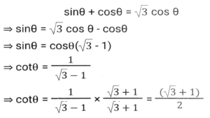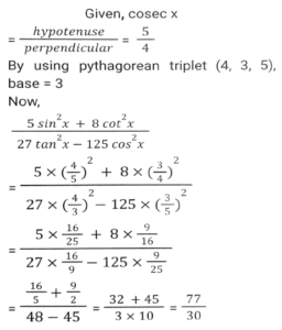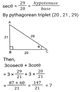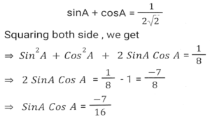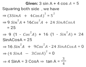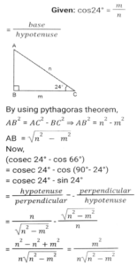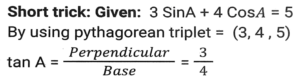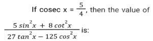 Trigonometry (Part-3)Total Questions: 5021. If secθ = 29/20 where 0 < θ < 90ᵒ, then what is the value of 3cosecθ + 3cotθ ? [SSC CGL 17/09/2024 (1st Shift)](a) 7/3(b) 7(c) 14(d) 49Correct Answer: (b) 7Solution:22. If cos24ᵒ =m/n, then the value of (cosec24ᵒ - cos66ᵒ) is: [SSC CGL 17/09/2024 (1st Shift)](a)(b)(c)(d)Correct Answer: (d)Solution:23. Find the value of [SSC CGL 17/09/2024 (2nd Shift)](a) -1(b) 1(c) 2(d) 0Correct Answer: (a) -1Solution:24. If sinA + cosA = 1/2√2, then find the value of sin⁴A + cos⁴A. [SSC CGL 17/09/2024 (2nd Shift)](a) 79/128(b) 7/13(c) 79/126(d) 5/13Correct Answer: (a) 79/128Solution:25. If a = xcosθ + ysinθ and b = xsinθ - ycosθ, then a² + b² is equal to: [SSC CGL 17/09/2024 (2nd Shift)](a) x + y(b) x² - y²(c) x² + y²(d) x - yCorrect Answer: (c) x² + y²Solution:26. Simplify [SSC CGL 17/09/2024 (3rd Shift)](a) 33/91(b) 77/30(c) 55/87(d) 99/47Correct Answer: (b) 77/30Solution:27. If sinθ + cosθ = √3 cosθ, then the value of cot θ is: [SSC CGL 17/09/2024 (3rd Shift)](a)(b)(c)(d)Correct Answer: (b)Solution:28. If sec(t) = x/y, then cot(t) is equal to: [SSC CGL 18/09/2024 (1st Shift)](a)(b)(c)(d)Correct Answer: (a)Solution:29. At what angle θ, the value of sin (θ) and cos (θ) will have the same value ? [SSC CGL 18/09/2024 (1st Shift)](a) 45ᵒ(b) 30ᵒ(c) 60ᵒ(d) 75ᵒCorrect Answer: (a) 45ᵒSolution:30. If 3 sin A + 4 cos A = 5, then the value of tan A is: [SSC CGL 18/09/2024 (1st Shift)](a) 3/4(b) 3/5(c) 5/4(d) 4/5Correct Answer: (a) 3/4Solution:Submit Quiz« Previous12345Next »