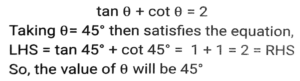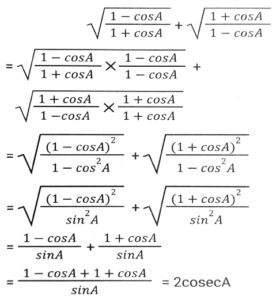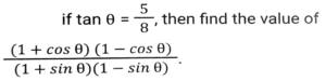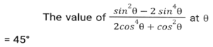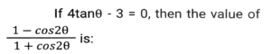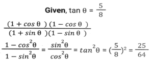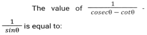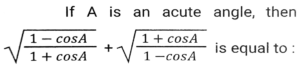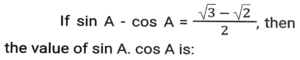 Trigonometry (Part-3)Total Questions: 5041. Simplify [SSC CGL 19/09/2024 (3rd Shift)](a) 5/64(b) 2/25(c) 25/64(d) 64/25Correct Answer: (c) 25/64Solution:42. If tan θ + cot θ = 2, and θ is an acute angle, then the value of θ is: [SSC CGL 19/09/2024 (3rd Shift)](a) 30ᵒ(b) 15ᵒ(c) 60ᵒ(d) 45ᵒCorrect Answer: (d) 45ᵒSolution:43. Simplify [SSC CGL 19/09/024 (1st Shift)](a) 2cosecA(b) 2cosA(c) 2secA(d) 2sinACorrect Answer: (a) 2cosecASolution:44. The value of θ, when √3 cosθ + sinθ = 1 (1 ≤ θ ≤ 90ᵒ), is: [SSC CGL 23/09/024 (1st Shift)](a) 20ᵒ(b) 60ᵒ(c) 90ᵒ(d) 30ᵒCorrect Answer: (c) 90ᵒSolution:45. Let x = r cos (t), y = r sin (t) cos (u), z = r sin (t) sin (u). Then the value of x² + y² + z² is _______ . [SSC CGL 23/09/2024 (1st Shift)](a) r² cos (u)(b) r²(c) 2r(d) r² sin (t)Correct Answer: (b) r²Solution:46. Simplify [SSC CGL 23/09/2024 (1st Shift)](a) 1(b) 7/15(c) 4/3(d) 9/16Correct Answer: (d) 9/16Solution:47. Solve it- [SSC CGL 23/09/2024 (2nd Shift)](a)(b)(c)(d)Correct Answer: (c)Solution:48. If cosA + cos²A = 1 then sin²A + sin⁴A is equal to: [SSC CGL 23/09/2024 (2nd Shift)](a)(b)(c)(d)Correct Answer: (d)Solution:49. Simplify [SSC CGL 23/09/2024 (2nd Shift)](a) tanθ(b) cosecθ(c) cotθ(d) secθCorrect Answer: (c) cotθSolution:50. Solve it- [SSC CGL 23/09/2024 (3rd Shift)](a) 1(b) 0(c) 3(d) 2Correct Answer: (b) 0Solution:Submit Quiz« Previous12345