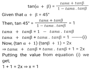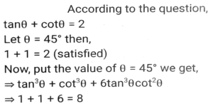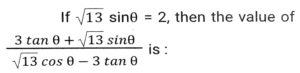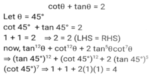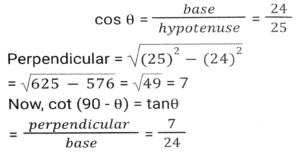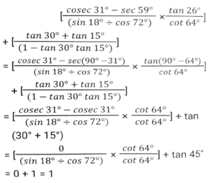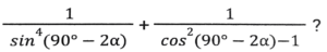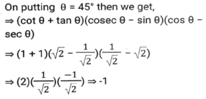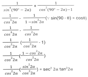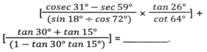 Trigonometry (Part-4)Total Questions: 5031. If θ is an acute angle and tanθ + cotθ = 2, then find the value of tan³θ + cot³θ + 6tan³θ cot²θ. [SSC CHSL 02/07/2024 (3rd Shift)](a) 8(b) 10(c) 12(d) 6Correct Answer: (a) 8Solution:32. Simpify [SSC CHSL 02/07/2024 (4th Shift)](a) 2(b) 3(c) 0(d) 4Correct Answer: (d) 4Solution:33. (cotθ + tanθ) (cosecθ - sinθ) (cosθ - secθ) = ______ . [SSC CHSL 03/07/2024 (1st Shift)](a) -1(b) 2(c) 0(d) 1Correct Answer: (a) -1Solution:34. Find the value of the following expression. [SSC CHSL 03/07/2024 (2nd Shift)]sin(30 + θ) - cos(60 - θ)(a) √3/2(b) 2sin (30 + θ)(c) 1(d) 0Correct Answer: (d) 0Solution:35. If α + β = 45° and (tan α+1) (tan β +1) = 2x, then x is: [SSC CHSL 03/07/2024 (4th Shift)](a) -1(b) 0(c) 1(d) 2Correct Answer: (c) 1Solution:36. What is the value of tan 570° ? [SSC CHSL 04/07/2024 (1st Shift)](a)(b)(c)(d)Correct Answer: (c)Solution:37. What is the value of- [SSC CHSL 04/07/2024 (2nd Shift)](a) sin²2α + tan²2α(b) sec²2α + cot²2α(c) cos²2α cot²2α(d) sec² 2α tan² 2αCorrect Answer: (d) sec² 2α tan² 2αSolution:38. If θ is an acute angle and cotθ + tanθ = 2 then find the value of tan¹²θ + cot¹²θ + 2tan⁵θcot⁷θ. [SSC CHSL 04/07/2024 (3rd Shift)](a) 2(b) 3(c) 4(d) 1Correct Answer: (c) 4Solution:39. If θ be acute angle and cos θ = 24/25, then the value of cot (90-θ) is equal to: [SSC CHSL 05/07/2024 (3rd Shift)](a) 6/25(b) 7/24(c) 7/25(d) 5/24Correct Answer: (b) 7/24Solution:40. Simplify [SSC CHSL 05/07/2024 (4th Shift)](a) -1(b) 0(c) 1(d) 2Correct Answer: (c) 1Solution:Submit Quiz« Previous12345Next »
