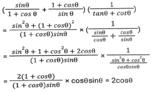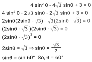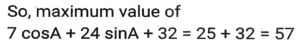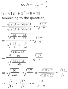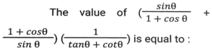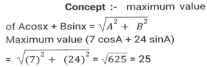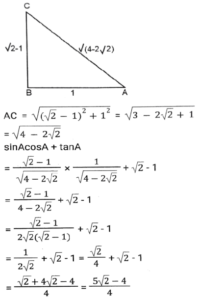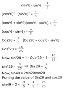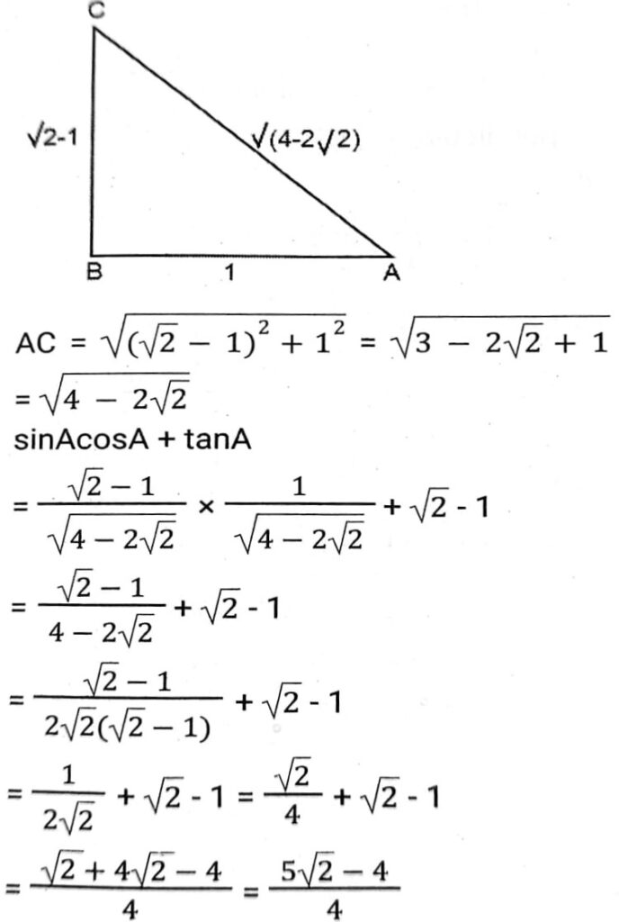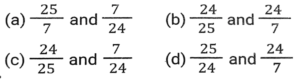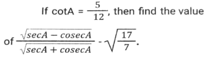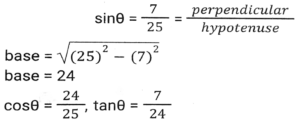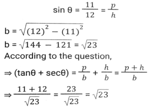 Trigonometry (Part-4)Total Questions: 5041. Simplify [SSC CHSL 08/07/2024 (1st Shift)](a)(b)(c)(d)Correct Answer: (d)Solution:42. If tan(t) = 3/7, t is an acute angle, then what is the value of cosec(t) ? [SSC CHSL 08/07/2024 (2nd Shift)](a) √58/3(b) √53/7(c) √58/7(d) √53/3Correct Answer: (a) √58/3Solution:43. If sin θ = 11/12, then what will be the value of (tanθ + secθ)? [SSC CHSL 08/07/2024 (3rd Shift)](a) 12/√23(b) 11/√23(c) √23(d) 23Correct Answer: (c) √23Solution:44. If cos⁴θ - sin⁴θ = 4/5, then find the value of sin4θ. [SSC CHSL 08/07/2024 (4th Shift)](a) 24/25(b) 16/25(c) 21/25(d) 18/25Correct Answer: (a) 24/25Solution:45. Simplify [SSC CHSL 09/07/2024 (1st Shift)](a)(b)(c)(d)Correct Answer: (b)Solution:46. If sinθ = 7/25, then cosθ and tanθ are respectively _______ . (Where θ is in the first quadrant) [SSC CHSL 09/07/2024 (3rd Shift)](a)(b)(c)(d)Correct Answer: (c)Solution:47. What is the maximum value of 7 cosA + 24 sinA + 32? [SSC CHSL 09/07/2024 (4th Shift)](a) 39(b) 32(c) 25(d) 57Correct Answer: (d) 57Solution:48. If tanA = √2 - 1 then find the value of sinAcosA + tanA. [SSC CHSL 10/07/2024 (1st Shift)](a)(b)(c)(d)Correct Answer: (d)Solution:49. If 4 sin²θ - 4√3 sinθ + 3 = 0, then find the value of θ. (0 < θ < 90ᵒ) [SSC CHSL 10/07/2024 (3rd Shift)](a) 45ᵒ(b) 30ᵒ(c) 60ᵒ(d) 75ᵒCorrect Answer: (c) 60ᵒSolution:50. Simplify [SSC CHSL 11/07/2024 (1st Shift)](a) tanθ(b) 2 sinθ(c) 2 cosθ(d) 1Correct Answer: (c) 2 cosθSolution:Submit Quiz« Previous12345
