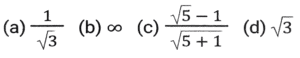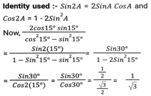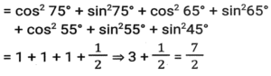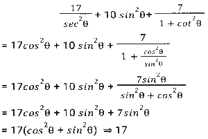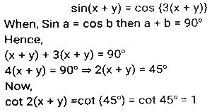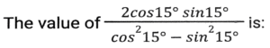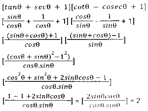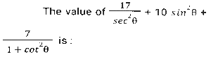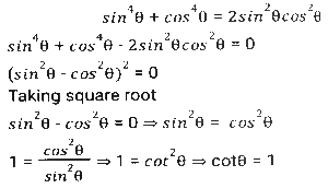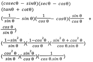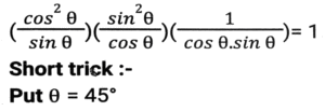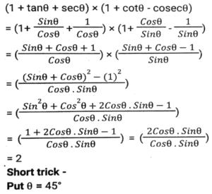 Trigonometry (Part-5)Total Questions: 5021. If sin⁴θ + cos⁴θ = 2sin²θ cos²θ, 0º < θ < 90º, then find the value of cotθ. [SSC CPO 29/06/2024 (1st Shift)](a) 1/2(b) 1/√2(c) 1/3(d) 1Correct Answer: (d) 1Solution:22. tan⁴A + tan²A is equal to: [SSC CPO 29/06/2024 (1st Shift)](a) sec²A - sec⁴A(b) -(sec²A + sec⁴A)(c) sec⁴A - sec²A(d) sec⁴A + sec²ACorrect Answer: (c) sec⁴A - sec²ASolution:23. Solve the following: [SSC CPO 29/06/2024 (1st Shift)](tanθ + secθ + 1) (cotθ - cosecθ + 1) =?(a) 2(b) 1(c) 0(d) -1Correct Answer: (a) 2Solution:24. The value of (cosecθ -sinθ) (secθ - cosθ) (tanθ + cotθ) is [SSC CPO 29/06/2024 (1st Shift)](a) -3(b) 3(c) secθ cosecθ(d) 1Correct Answer: (d) 1Solution:25. Find the value of the following expression. [SSC CPO 29/06/2024 (2nd Shift)](1 + tanθ + secθ) × (1 + cotθ - cosecθ)(a) 1(b) cosθ sinθ(c) 2(d) tanθCorrect Answer: (c) 2Solution:26. Simplify [SSC CPO 29/06/2024 (2nd Shift)](a) Not defined(b) 1(c) √3(d) 0Correct Answer: (a) Not definedSolution:27. If sin (x+y) = cos{3(x+y)}, then, the value of cot {2(x+y)} is______ . [SSC CPO 29/06/2024 (2nd Shift)](a) -1(b) 1(c) -2(d) 2Correct Answer: (b) 1Solution:28. Simplify [SSC CPO 29/06/2024 (2nd Shift)](a)(b)(c)(d)Correct Answer: (a)Solution:29. Solve it- [SSC CPO 29/06/2024 (3rd Shift)](a) 34(b) 20(c) 17(d) 19Correct Answer: (c) 17Solution:30. The value of sin²15º + sin²25º + sin²35º + sin²45º + sin²55º + sin²65º + sin²75º is: [SSC CPO 29/06/2024 (3rd Shift)](a) 4(b) 7(c) 7/2(d) 7/3Correct Answer: (c) 7/2Solution:Submit Quiz« Previous12345Next »
