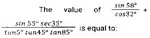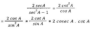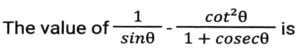 Trigonometry (Part-6)Total Questions: 5031. The given expression is equal to: [SSC CHSL 07/08/2023 (3rd Shift)](a) 2 cosecA cotA(b) 2 cosA cotA(c) 2 cosecA tanA(d) 2 cosA sinACorrect Answer: (a) 2 cosecA cotASolution:32. The given expression is equal to: [SSC CHSL 07/08/2023 (3rd Shift)](a) 1 - sinA(b) 1 + cosA(c) SinA(d) CosACorrect Answer: (a) 1 - sinASolution:33. The value of sin²30º + sin²40º + sin²45º + sin²55º + sin²35º + sin²45º + sin²50º + sin²60º is: [SSC CHSL 07/08/2023 (3rd Shift)](a) 2(b) 4(c) 3(d) 1Correct Answer: (b) 4Solution:34. Simplify the given expression. [SSC CHSL 07/08/2023 (4th Shift)](a) 2(b) -1(c) 3(d) 1Correct Answer: (a) 235. Solve it- [SSC CHSL 07/08/2023 (4th Shift)](a) 2(b) 1(c) -1(d) 0Correct Answer: (b) 1Solution:36. Simplify [SSC CHSL 07/08/2023 (4th Shift)](a) 2(b) 1(c) 0(d) 3Correct Answer: (a) 2Solution:37. Simplify [SSC CHSL 08/08/2023 (1st Shift)](a)(b)(c)(d)Correct Answer: (c)Solution:38. Find the value of- [SSC CHSL 08/08/2023 (1st Shift)](a) 1/2(b) 1(c) -1(d) 0Correct Answer: (d) 0Solution:39. Simplify the given expression. [SSC CHSL 08/08/2023 (2nd Shift)](a) cosec²A - cotA(b) cosec²A + cotA(c) cot²A + cosecA(d) cot²A - cosecACorrect Answer: (b) cosec²A + cotASolution:40. If Tanθ + Secθ = α, then what is Secθ equal to: [SSC CHSL 08/08/2023 (2nd Shift)](a)(b)(c)(d)Correct Answer: (d)Solution:Submit Quiz« Previous12345Next »