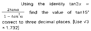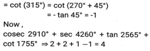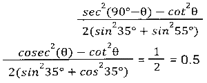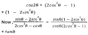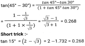 Trigonometry (Part-7)Total Questions: 5041. Simplify the following. [SSC CGL 19/07/2023 (1st Shift)](a) 0.5(b) 2(c) 1.5(d) 1Correct Answer: (a) 0.5Solution:42. cosec 2910º + sec 4260º + tan 2565º + cot 1755º =? [SSC CGL 20/07/2023 (1st Shift)](a) 3(b) 1(c) 4(d) 0Correct Answer: (c) 4Solution:43. The maximum value of (sin¹²θ + cos²⁰θ) fo all the real values of θ is: [SSC CGL 20/07/2023 (3rd Shift)](a) 2(b) 3(c) 1(d) 0Correct Answer: (c) 1Solution:44. What is the value of sin (-405º) ? [SSC CGL 20/07/2023 (3rd Shift)](a) √5/2(b) 1/2(c) -1/2(d) -1/√2Correct Answer: (d) -1/√2Solution:45. Simplify the following expression. [SSC CGL 21/07/2023 (3rd Shift)](a) tanθ(b) sinθ(c) secθ(d) cosθCorrect Answer: (a) tanθSolution:46. Simplify [SSC CGL 21/07/2023 (4th Shift)](a) 4 tan t. sin t(b) tan t. sec t(c) tan t - sin t(d) tan t + sin tCorrect Answer: (b) tan t. sec tSolution:47. PQR is a triangle right angled at Q and PQ : QR = 3 : 4 . What is the value of sinP + sinQ + sinR ? [SSC CGL 21/07/2023 (4th Shift)](a) 4/5(b) 3/5(c) 12/5(d) 2/5Correct Answer: (c) 12/5Solution:48. Simplify [SSC CGL 24/07/2023 (1st Shift)](a) 1/√13(b) 2/√13(c) 0(d) 2/3Correct Answer: (c) 0Solution:49. Simplify [SSC CGL 24/07/2023 (1st Shift)](a) 0.268(b) 0.27(c) 0.267(d) 0.269Correct Answer: (a) 0.268Solution:50. Simplify [SSC CGL 24/07/2023 (2nd Shift)](a) 1(b) 0(c) cosθ(d) -sinθCorrect Answer: (c) cosθSolution:Submit Quiz« Previous12345