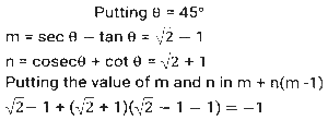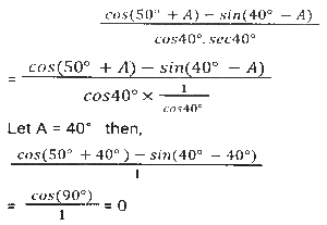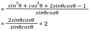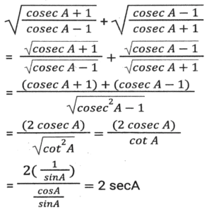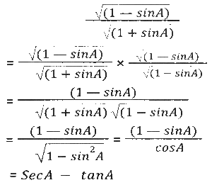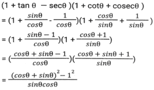 Trigonometry (Part-8)Total Questions: 5021. Find the value of- [SSC CHSL 09/03/2023 (2nd Shift)](a) sec²A(b) secA + tanA(c) tan²A(d) secA - tanACorrect Answer: (d) secA - tanASolution:22. What is the value of (1 + tanθ - secθ) (1 + cotθ + cosecθ) [SSC CHSL 09/03/2023 (3rd Shift)](a) -1(b) 0(c) 1(d) 2Correct Answer: (d) 2Solution:23. What is the value of- [SSC CHSL 10/03/2023 (1st Shift)](a) 1(b) 2(c) 0.5(d) 0Correct Answer: (d) 0Solution:24. If tanA + secA = K, then what is the value of sinA? [SSC CHSL 10/03/2023 (1st Shift)](a)(b)(c)(d)Correct Answer: (d)Solution:25. Simplify [SSC CHSL 10/03/2023 (2nd Shift)](a) 0(b) 4/3(c) 1/4(d) 3/4Correct Answer: (b) 4/3Solution:26. What is the value of- [SSC CHSL 13/03/2023 (1st Shift)](a) 2 cosA(b) secA(c) cosA(d) 2 secACorrect Answer: (d) 2 secASolution:27. If m = secθ - tanθ and n = cosecθ + cotθ, then what is the value of m + n (m-1) ? [SSC CHSL 13/03/2023 (2nd Shift)](a) 0(b) 2(c) 1(d) -1Correct Answer: (d) -1Solution:28. △ABC is a right angled triangle. ∠ A = 90 degree, AB = 4cm, BC = cm. What is the value of cos B + cot C ? [SSC CHSL 13/03/2023 (3rd Shift)](a) 17/20(b) 29/20(c) 23/20(d) 31/20Correct Answer: (d) 31/20Solution:29. If △PQR is right angled at Q, then what is the value of cos (P + R)? [SSC CHSL 13/03/2023 (4th Shift)](a) 0.5(b) 1(c) 0.2(d) 0Correct Answer: (d) 0Solution:30. If √3 tan²θ - 4 tanθ + √3 = 0, then what is the value of tan²θ + cot²θ ? [SSC CHSL 13/03/2023 (4th Shift)](a) 4/3(b) 10/3(c) 3(d) 6/5Correct Answer: (b) 10/3Solution:Submit Quiz« Previous12345Next »