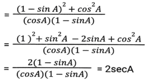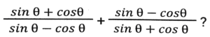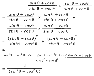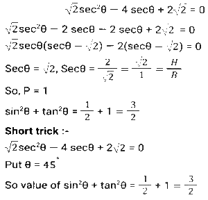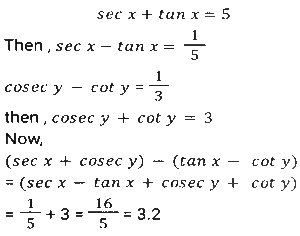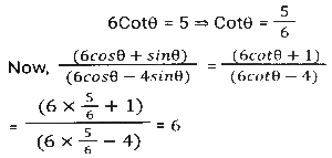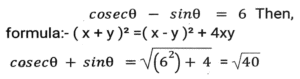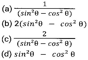 Trigonometry (Part-8)Total Questions: 5031. If 6cotθ = 5, then find the value of- [SSC CHSL 14/03/2023 (2nd Shift)](a) 5(b) 1(c) 6(d) 0Correct Answer: (c) 6Solution:32. If - sinθ + cosecθ = 6, then what is the value of sinθ + cosecθ?(a) 6(b) √40(c) √34(d) √38Correct Answer: (b) √40Solution:33. If √2sec²θ - 4 secθ + 2√2 = 0, then what is the value sin²θ + tan²θ ? [SSC CHSL 14/03/2023 (3rd Shift)](a) 1/2(b) 2/3(c) 5/2(d) 3/2Correct Answer: (d) 3/2Solution:34. What is the value of- [SSC CHSL 14/03/2023 (4th Shift)](a)(b)(c)(d)Correct Answer: (c)Solution:35. Simplify the following expression. [SSC CHSL 15/03/2023 (1st Shift)](a) 2 sinA(b) 2 cosA(c) 2 secA(d) 2 tanACorrect Answer: (c) 2 secASolution:36. If sec x + tan x = 5 and cosec y - cot y = 1/3 then find the value of (sec x + cosec y) - (tan x - cot y). [SSC CHSL 15/03/2023 (1st Shift)](a) 2.2(b) 3.2(c) 4.2(d) 3.1Correct Answer: (b) 3.2Solution:37. If A = a cosecθ + b cotθ and B = a cotθ + b cosecθ, then what is the value of A² - B² ? [SSC CHSL 15/03/2023 (4th Shift)](a) ab(b) (a + b)(c) (a² - b²)(d) (a - b)Correct Answer: (c) (a² - b²)Solution:38. If cosecθ + cotθ = s, then what is the value of cosθ ? [SSC CHSL 16/03/2023 (2nd Shift)](a)(b)(c)(d)Correct Answer: (a)Solution:39. Find the value of tan x, if sec x + tan x = √3 and x lies between 0º and 90º. [SSC CHSL 16/03/2023 (3rd Shift)](a) √3(b) 1(c) 1/√3(d) 0Correct Answer: (c) 1/√3Solution:40. Tan of complementary of an angles is same as which of the angles ? [SSC CHSL 17/03/2023 (1st Shift)](a) sin of that angle(b) cot of that angle(c) cos of that angle(d) cosec of that angleCorrect Answer: (b) cot of that angleSolution:Complementary angle of tan = cotSubmit Quiz« Previous12345Next »