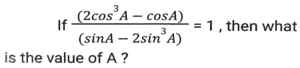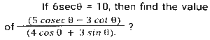 Trigonometry (Part-8)Total Questions: 5041. If secθ + tanθ = 2, then what is the value of cotθ ? [SSC CHSL 17/03/2023 (2nd Shift)](a) 5/3(b) 3/5(c) 4/3(d) 3/4Correct Answer: (c) 4/3Solution:º42. What is the value of (tan 10º tan 80º + tan 20º tan 70º + tan 30º tan 60º + tan 40º tan 50º)? [SSC CHSL 20/03/2023 (4th Shift)](a) 4(b) 3(c) 5(d) 2Correct Answer: (a) 4Solution:θ43. What is the value of- [SSC CHSL 20/03/2023 (2nd Shift)](a) 2 secθ(b) 2 cosecθ(c) 2 cotθ(d) cotθ + cosecθCorrect Answer: (d) cotθ + cosecθ44. Simplify [SSC CHSL 20/03/2023 (3rd Shift)](a) 2/3(b) 3/2(c) 5/6(d) 6/5Correct Answer: (c) 5/645. What is the value of cosecA (1 - cosA) (cosecA + cotA) ? [SSC CHSL 21/03/203 (2nd Shift)](a) 2(b) 1(c) 0(d) 3Correct Answer: (b) 1Solution:º46. Simplify [SSC CHSL 21/03/2023 (2nd Shift)](a) 90º(b) 30º(c) 45º(d) 60ºCorrect Answer: (c) 45º47. (sinθ + cosecθ)² + (cosθ + secθ)² = ? [SSC CGL Tier II (07/03/2023)](a) 5 + tan²θ + cot²θ(b) 7 + tan²θ - cot²θ(c) 7 + tan²θ + cot²θ(d) 5 + tan²θ - cot²θCorrect Answer: (c) 7 + tan²θ + cot²θ48. The value of tan²θ + cot²θ - sec²θ cosec is: [SSC CGL 01/12/2023 (1st Shift)](a) 1(b) -2(c) 0(d) 1/2Correct Answer: (b) -249. What is sinα - sinβ ? [SSC CGL 01/12/2023 (2nd Shift)](a)(b)(c)(d)Correct Answer: (a)Solution:º50. What is the value of tan 240º ? [SSC CGL 01/12/2023 (3rd Shift)](a) √2(b) (-√3)(c) √3(d) 3Correct Answer: (c) √3Submit Quiz« Previous12345