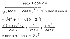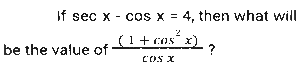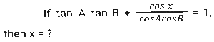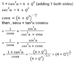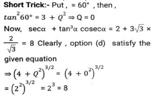 Trigonometry (Part-9)Total Questions: 5021. If tan² α = 3 +Q², then sec α + tan³ α cosec α = ? [SSC CGL 07/12/2022 (1st Shift)](a)(b)(c)(d)Correct Answer: (d)Solution:22. If 1 + sinθ = mcosθ, then what is the value sinθ? [SSC CGL 07/12/2022 (2nd Shift)](a)(b)(c)(d)Correct Answer: (b)Solution:23. Find the value of the following expression. [SSC CGL 07/12/2022 (3rd Shift)]5 (sin⁴θ + cos⁴θ) + 3 (sin⁶θ + cos⁶θ) + 19 sin²θ cos²θ(a) 8(b) 5(c) 6(d) 7Correct Answer: (a) 8Solution:24. If sin Y = x, then what will be the value of cos 2Y (where 0 ≤ Y ≤ 90º)? [SSC CGL 08/12/2022 (1st Shift)](a) (√2 - 1)x(b) √2x(c) 1 - 2x(d) 1 - 2x²Correct Answer: (d) 1 - 2x²Solution:25. If A + B = C, then tanA tanB tanC = ? [SSC CGL 08/12/2022 (1st Shift)](a) tanC + tanA - tanB(b) tanC + tanA + tanB(c) tanA - tanB - tanC(d) tanC - tanA - tanBCorrect Answer: (d) tanC - tanA - tanBSolution:26. Simplify [SSC CGL 08/12/2022 (1st Shift)](a) 4(b) 6(c) 8(d) 2Correct Answer: (d) 2Solution:27. θ = 135º; y = 15º. What is the value of 2cos(θ) sin(y)? [SSC CGL 08/12/2022 (3rd Shift)](a)(b)(c)(d)Correct Answer: (b)Solution:28. Simplify [SSC CGL 08/12/2022 (3rd Shift)](a) 9/4(b) 1/4(c) 2√5(d) √5Correct Answer: (c) 2√5Solution:29. Simplify [SSC CGL 08/12/2022 (4th Shift)](a) B(b) A(c) A+B(d) A-BCorrect Answer: (c) A+BSolution:30. cos³60º - cos³240º - cos³360º = ? [SSC CGL 09/12/2022 (1st Shift)](a) -3/4(b) -7/5(c) -3/5(d) -9/7Correct Answer: (a) -3/4Solution:Submit Quiz« Previous12345Next »