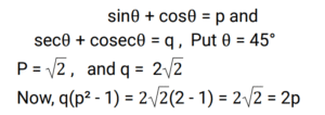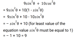 Trigonometry (Railway Maths) (Part – V)Total Questions: 5011. The minimum value of 9 sin²θ + 10 cos²θ is: [RRB NTPC 09/03/2021 (Evening)](a) 1(b) 0(c) 8(d) 9Correct Answer: (d) 9Solution:12. If 2xy cosθ + (x² - y²) sinθ = x² + y², then the value of tanθ is: [RRB NTPC 09/03/2021 (Evening)](a) (x² - y²) / (x² + y²)(b) (x² + y²) / 2xy(c) (x² - y²) / 2xy(d) (y² - x²) / 2xyCorrect Answer: (c) (x² - y²) / 2xySolution:13. tan 100° + tan 125° + tan 100° + tan 125° is equal to: [RRB NTPC 11/03/2021 (Morning)](a) 1/2(b) 1(c) 0(d) -1Correct Answer: (b) 1Solution:14. Solve the given equation. sin 21° cos 9° - cos 84° cos 6° = ? [RRB NTPC 11/03/2021 (Morning)](a) 1/2(b) 1/4(c) 1/8(d) 1Correct Answer: (b) 1/4Solution:15. sinα = 1/√5 and cosβ = 3/√10, then find the value of α + β [RRB NTPC 12/03/2021 (Morning)](a) 30°(b) 45°(c) 90°(d) 60°Correct Answer: (b) 45°Solution:16. If sinθ + cosθ = 1, then the value of tan 2θ is: [RRB NTPC 12/03/2021 (Morning)](a) 1/2(b) -1(c) 1(d) 0Correct Answer: (d) 0Solution:17. Find the value of sin34° + cos64° - cos4°. [RRB NTPC 12/03/2021 (Evening)](a) 1(b) 1/2(c) 3/4(d) 0Correct Answer: (d) 0Solution:18. If sinθ + cosθ = p and secθ + cosecθ = q, then the value of q(p² - 1) is. [RRB NTPC 13/03/2021 (Morning)](a) p²(b) p² + 1(c) 2p(d) pCorrect Answer: (c) 2pSolution:19. In the triangle ABC, a = 25, b = 45, and c = 30. The value of cosA is: [RRB NTPC 13/03/2021 (Evening)](a) 21/27(b) 25/27(c) 20/27(d) 23/27Correct Answer: (d) 23/27Solution:20. If sinA = 4/√17, then tan2A = ? (0° < A < 90°) [RRB NTPC 14/03/2021 (Morning)](a) -4/15(b) -8/15(c) 7/15(d) -21/15Correct Answer: (b) -8/15Solution:Submit Quiz« Previous12345Next »