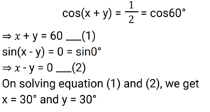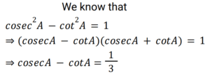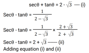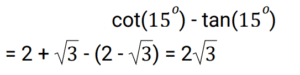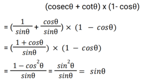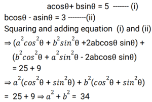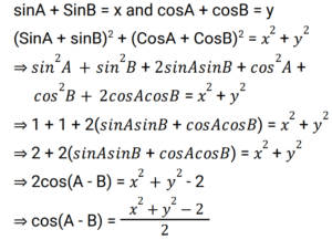 Trigonometry (Railway Maths) (Part – V)Total Questions: 5021. If cosecA - cotA = 3 then cosecA + cotA = ? [RRB NTPC 14/03/2021 (Morning) ](a) 1/3(b) 3/2(c) 1/2(d) 1/5Correct Answer: (a) 1/3Solution:22. If sinA + SinB = x and cosA + cosB = y , then cos(A - B) = ? [RRB NTPC 14/03/2021 (Evening) ](a)(b)(c)(d)Correct Answer: (d)Solution:23. If cos(x + y) = 1/2 and sin(x - y) = 0, where x and y are positive acute angles and x ≥ y, then x and y are: [RRB NTPC 14/03/2021 (Evening)](a) 90° and 30°(b) 60° and 60°(c) 30° and 30°(d) 60° and 45°Correct Answer: (c) 30° and 30°Solution:24. What is the value of sin ? 15⁰ ? [RRB NTPC 15/03/2021 (Morning) ](a)(b)(c)(d)Correct Answer: (c)Solution:25. What is the value of cot(15°) - tan(15°) ? [RRB NTPC 15/03/2021 (Evening) ](a) √3/2(b) 2(c) 2√3(d) 4Correct Answer: (c) 2√3Solution:26. If cosx - 3sinx = √3 sinx, then the value of tanx is: [RRB NTPC 15/03/2021 (Evening)](a) 3 - √3 / 6(b) 3 - √3(c) √3(d) 3 + √3Correct Answer: (a) 3 - √3 / 6Solution:27. If tanα = 5/3 and tanβ = 4, then α + β is: [RRB NTPC 19/03/2021 (Evening)](a) 135°(b) 145°(c) 125°(d) 160°Correct Answer: (a) 135°Solution:28. If acosθ + bsinθ = 5 and bcosθ - asinθ = 3, then the relation between a and b is _______. [RRB NTPC 01/04/2021 (Evening)](a) 1/a² + 1/b² = 2(b) a² - b² = 16(c) a² + b² = 34(d) 1/a² - 1/b² = 1Correct Answer: (c) a² + b² = 34Solution:29. The value of (cosecθ + cotθ)(1 - cosθ) is: [RRB NTPC 05/04/2021 (Morning)](a) cosecθ(b) cosecθ(c) sinθ(d) secθCorrect Answer: (c) sinθSolution:30. If secθ + tanθ = 2 - √3, then the value of √3sinθ + cosθ is: [RRB NTPC 05/04/2021 (Evening)](a) 2(b) 3(c) 1(d) 4Correct Answer: (a) 2Solution:Submit Quiz« Previous12345Next »