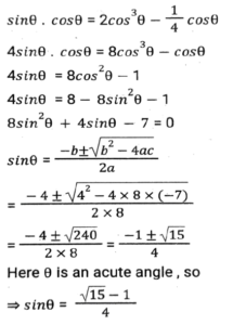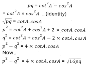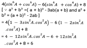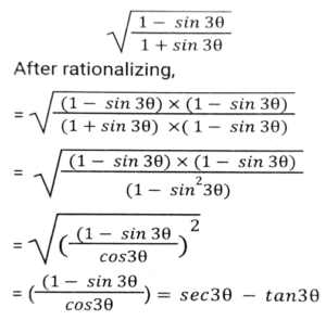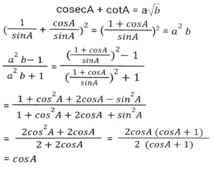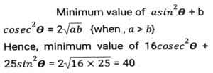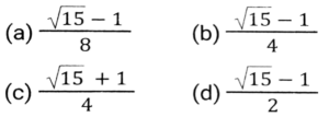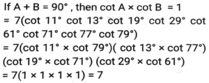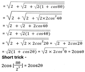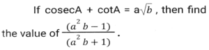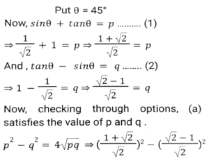 TrigonometryTotal Questions: 5021. Find the least value of 16cosec²θ + 25sin²θ. [SSC CPO 04/10/2023 (3rd Shift)](a) 35(b) 38(c) 42(d) 40Correct Answer: (d) 40Solution:22. Find the value of [SSC CHSL 17/08/2023 (2nd Shift)](a) cosA(b) tanA(c) 1/sinA(d) 1/cotACorrect Answer: (a) cosASolution:23. If sinθ + tanθ = p and tanθ - sinθ = q, then which of the relation satisfies for given values of p and q? [SSC CHSL 11/08/2023 (4th Shift)](a)(b)(c)(d)Correct Answer: (a)Solution:24. If θ an acute angle and sinθ cosθ = 2 cos³θ - 1/4 cosθ, then the value of sinθ is : [SSC CHSL 10/08/2023 (2nd Shift)](a)(b)(c)(d)Correct Answer: (b)Solution:25. Simplify the following: 7(cot 11⁰ cot 13⁰ cot 19⁰ cot 29⁰ cot 61⁰ cot 71⁰ cot 77⁰ cot79⁰) [SSC CHSL 09/08/2023 (3rd Shift)](a) 7(b) -7(c) -1(d) 1Correct Answer: (a) 7Solution:26. The given expression is equal to : [SSC CHSL 09/08/2023 (2nd Shift)](a) 1(b) -1(c) 0(d) 2Correct Answer: (a) 1Solution:27. If cot A + cos A = p and cot A - cos A = q, then which of the following relation is correct ? [SSC CHSL 03/08/2023 (4th Shift)](a)(b)(c)(d)Correct Answer: (c)Solution:28. The value of the following 4(sin⁶ A + cos⁶ A) - 6(sin⁴ A + cos⁴ A) + 8 is : [SSC CHSL 02/07/2023 (4th Shift)](a) 4(b) 8(c) 7(d) 6Correct Answer: (d) 6Solution:29. Evaluate the following: [SSC CGL 27/07/2023 (3rd Shift)](a) 2cosθ(b) 2cos2θ(c) sin2θ(d) cos2θCorrect Answer: (a) 2cosθSolution:30. Find the value of [SSC CGL 21/07/2023 (2nd Shift)](a) sec 3θ - tan 3θ(b) (sec 3θ - tan 3θ)³(c) (sec 3θ - tan 3θ)²(d) sec 3θ + tan 3θCorrect Answer: (a) sec 3θ - tan 3θSolution:Submit Quiz« Previous12345Next »