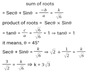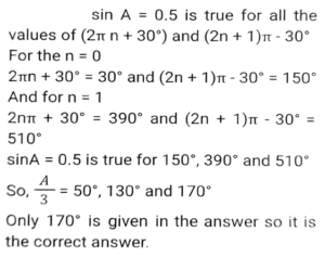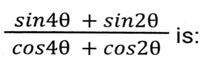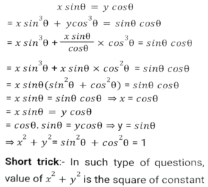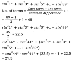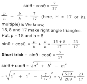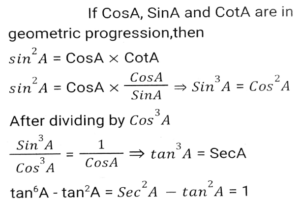 TrigonometryTotal Questions: 5041. The value of- [SSC CHSL 27/05/2022 (Morning)](a) tan3θ(b) cot3θ(c) tanθ(d) cotθCorrect Answer: (a) tan3θSolution:42. The value of cot² 46⁰ - sec² 44⁰ + (sin² 1 + sin² 3⁰ + sin² 5⁰ +....+ sin² 89⁰. [SSC CHSL 10/08/2021 (Evening)](a) 23.5(b) 20.5(c) 22.5(d) 21.5Correct Answer: (d) 21.5Solution:43. If the between 45⁰ and 540⁰, and sinA = 0.5, what is the value of A/3 in degree ? [SSC CHSL 15/04/2021 (Morning)](a) 170⁰(b) 175⁰(c) 165⁰(d) 160⁰Correct Answer: (a) 170⁰Solution:44. If cos 27⁰ = x, then the value of tan 63⁰ is: [SSC CHSL 26/10/2020 (Evening)](a)(b)(c)(d)Correct Answer: (d)Solution:45. If x sin³θ + y cos³θ = sinθ cosθ and x sinθ = y cosθ, then the value of x² + y² is: [SSC CHSL (20/10/2020) (Morning)](a) 0(b) 4(c) 1(d) 2Correct Answer: (c) 1Solution:46. If cos²θ + cos⁴θ =1, then the value of sinθ + sin²θ is: [SSC CHSL 16/10/2020 (Morning)](a) 0(b) 1/2(c) 2(d) 1Correct Answer: (d) 1Solution:47. If sinθ - cosθ = 7/17, then find the value of sinθ + cosθ. [SSC CHSL 14/10/2023 (Morning)](a) 8/17(b) 23/13(c) 23/17(d) 8/13Correct Answer: (c) 23/17Solution:48. If secθ and sinθ (0⁰ < θ < 90⁰) are the roots of the equation √6x² - kx + √6 = 0, then the value of k is: [SSC CHSL 14/10/2020 (Morning)](a) √3(b) 3√2(c) 2√3(d) 3√3Correct Answer: (d) 3√3Solution:49. If cosA, sinA, cotA are in geometric progression, then the value of tan⁶A - tan²A is: [SSC CHSL 13/10/2020 (Afternoon)](a) 1/2(b) 3(c) 1/3(d) 1Correct Answer: (d) 1Solution:50. Find the value of Cos 225⁰ [SSC CHSL 17/03/2020 (Afternoon)](a) -0.7071(b) -0.866(c) 0.7071(d) 0.866Correct Answer: (a) -0.7071Solution:Submit Quiz« Previous12345