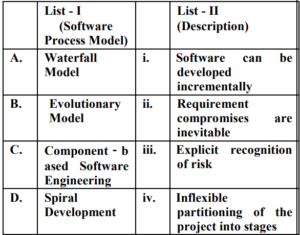 U.G.C. NET Exam. Dec. 2020-June 2021 Paper II (COMPUTER SCIENCE & APPLICATIONS)Total Questions: 10011. In software testing, beta testing is the testing performed by _______________.(a) potential customers at the developer's location(b) potential customers at their own locations(c) product developers at the customer's location(d) product developers at their own locationsCorrect Answer: (b) potential customers at their own locationsSolution:Beta testing is a type of user acceptance testing among the most crucial testing, which performed before the release of the software. Beta testing is a type of field test. This testing performs at the end of the software testing life cycle. This type of testing can be considered as external user acceptance testing. Beta testing always is done after the alpha testing, and before releasing it into the market. Beta testing is a black-box testing Beta testing performs in the absence of tester and the presence of real users. Beta testing generally is done for testing software product like utilities, operating systems, and applications, etc.12. The V components in MVC are responsible for:(a) User interface.(b) Security of the system.(c) Business logic and domain objects.(d) Translating between user interface actions/events and operations on the domain objects.Correct Answer: (a) User interface.Solution:In model-view-controller architectural pattern, there are following parts and there main responsibilities Model: Responsible for providing the app's "business logic". View: Responsible for providing the app's user interface (UI) Controller: Responsible for translating UI actions to operations on the model. So V components in MVC are responsible for user interface.13. In software engineering, what kind of notation do formal methods predominantly use?(a) textual(b) diagrammatic(c) mathematical(d) computer codeCorrect Answer: (c) mathematicalSolution:Formal method :- System design techniques that use rigorously specified mathematical model to build software, hardware system.14. If every requirement stated in the Software Requirement Specification (SRS) has only one interpretation, then SRS is said to be(a) correct(b) consistent(c) unambiguous(d) verifiableCorrect Answer: (c) unambiguousSolution:An SRS is said to be unambiguous if all the requirements stated have only 1 interpretation.15. A system has 99.99% uptime and has a meantime-between-failure of 1 day. How fast does the system has to repair itself in order to reach this availability goal?(a) ~9 Seconds(b) ~10 Seconds(c) ~11 Seconds(d) ~12 SecondsCorrect Answer: (a) ~9 SecondsSolution:16. In the context of Software Configuration Management (SCM), what kind of files should be committed to your source control repository?A. Code files B. Documentation files C. Output files D. Automatically generated files that are required for your system to be used Choose the correct answer from the options given below: (a) A and B only(b) B and C only(c) C and D only(d) D and A onlyCorrect Answer: (a) A and B onlySolution:Software configuration management - software configuration management (SCM or S/WCM) is the task of tracking and controlling changes in the software, part of the larger cross-disciplinary field of configuration management. SCM practices include revision control and the establishment of baseline. So following type of file should be committed to source control repository - A) code files B) Documentation files.17. Match List-I with List-II Choose the correct answer from the options given below:(a) A ‐ IV, B ‐ I, C ‐ III, D ‐ II(b) A ‐ I, B ‐ IV, C ‐ II, D ‐ III(c) A ‐ II, B ‐ III, C ‐ I, D ‐ IV(d) A ‐ IV, B ‐ I, C ‐ II, D ‐ IIICorrect Answer: (d) A ‐ IV, B ‐ I, C ‐ II, D ‐ IIISolution:Waterfall Model :-This model has five phases: Requirements analysis and specification, design, implementation and unit testing, integration and system testing and operation and maintenance. The steps always follow in this order and do not overlap. The developer must complete every phase before the next phase begins.Evolutionary Model :- The evolutionary model is an iterative model as they are characterized in a manner that enable software engineering to develop a complete version of the software. Such models are applied because the requirement often change. So the end product will be unrealistic for a complete version is impossible due to tight market deadlines. It is better to introduce a limited version. Thus, software engineering can follow a process model that has been explicit designed to accommodate a product that gradually complete over time. Component Based Development :- Component - based software engineering (CBSE) is an approach to software development that relies on the reuse of entities called 'software components'. • It emerged from the failure of object - oriented development to support effective reuse single object classes are too detailed and specific. • Components are more abstract than object classes and can be considered to be stand alone service providers. They can exist as stand-alone entities. Spiral Development:- This software development Life Cycle models, which provides support for risk Handling. In its diagrammatic representation, it looks like a spiral with many loops. The exact number of loops of the spiral is unknown and can vary from project to project. Four quadrants are 1) Objective determination and identify alternative solutions 2) Identify and resolve Risks 3) Develop next version of the product. 4) Review and plant for the next phase. 18. Identify the correct order of the following five levels of Capability Maturity Model (from lower to higher) to measure the maturity of an organization's software process.A. Defined B. Optimizing C. Initial D. Managed E. Repeatable Choose the correct answer from the options given below (a) C, A, E, D, B(b) C, E, A, B, D(c) C, B, D, E, A(d) C, E, A, D, BCorrect Answer: (d) C, E, A, D, BSolution:19. Given below are two s