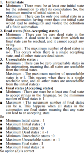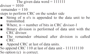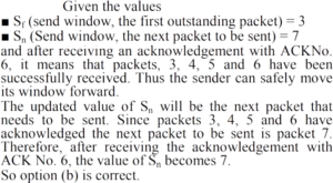 U.G.C. NET Exam. December 2022 Paper-II (COMPUTER SCIENCE) and Applicatations.Total Questions: 10031. While processing a string by an LR parser, the reading of the given string by the parser is .......(a) From right to left(b) From left to right(c) Can be either from left to right or right to left(d) From the centre of the given stringCorrect Answer: (b) From left to rightSolution:The leading of a given string by an LR parser is from left to right. LR (Left-to-right, right most derivation) parser is a type of shift reduce parser used in parsing computer languages. It starts from the leftmost end of the input string and builds the parse tree in a bottom up manner by repeatedly applying shift and reduce operations until the input is completely parsed. So option (b) is correct.32. What is the minimum and maximum number of initial, dead, unreachable and final states in a valid 'n' state finite automaton, where the language accepted is not 'ϕ'?(a) Minimum : 1, 1, 1, 1; Maximum : 1, (n-1), (n1), n(b) Minimum : 1, 0, 0, 0; Maximum : 1, (n–1), (n-1), n(c) Minimum : 1, 0, 0, n; Maximum: 1, n, (n-1), (n-1)(d) Minimum : 1, 0, 0, 1; Maximum: 1, (n-1), (n1), nCorrect Answer: (d) Minimum : 1, 0, 0, 1; Maximum: 1, (n-1), (n1), nSolution:The minimum and maximum number of initial, dead, unreachable, and final state can be defined as follows. 33. Which protocol is used to acquire the MAC address of a host whose IP address is known?(a) Dynamic Host control protocol(b) Address Resolution Protocol(c) Reverse Address Resolution Protocol(d) User Datagram ProtocolCorrect Answer: (b) Address Resolution ProtocolSolution:Address Resolution Protocol (ARP) is a procedure for mapping a dynamic IP address to permanent physical machine address in a local area network (LAN). The physical machine address is also know as a media access control (MAC) address.34. In CRC coding if the data word is 111111, divisor is 1010 and the remainder is 110. Which of the following code is true?(a) 011111101(b) 001010110(c) 111111110(d) 110111111Correct Answer: (c) 111111110Solution:35. Answer the following question(a) 6(b) 7(c) 5(d) 4Correct Answer: (b) 7Solution:36. What is the minimum Hamming Distance in a block code if we want to be able to detect up to S errors?(a) S(b) S+1(c) 1(d) 0Correct Answer: (b) S+1Solution:Hamming distance between two words of the same size is the number of differences between the corresponding bits. It can be calculated by applying the XOR operation. Formula To guarantee the detection of up to S errors in all cases the hamming distance in a block code must be d ≥ S + 1 hamming distance be minimum ∴ dmin = S + 1 So option (b) is correct37. Which search technique is complete and optimal, when h(n) is consitent?(c) A* Search(a) Best First Search(b) Depth First Search(d) Breadth First SearchCorrect Answer: (c) A* SearchSolution:When the heuristic function h(n) is consistent (also know as "admissible" or "monotonic", the A* search algorithm becomes both complete and optional. So option (c) is correct38. What is the process of capturing inference process as a single inference rule?(a) Ponens(b) Clauses(c) Generalized modus ponens(d) VariableCorrect Answer: (c) Generalized modus ponensSolution:All kinds of inference process can be captured as a single inference rule that can be called as generalized modus ponens.39. Fuzzy logic is a form of ____(a) Two valued logic(b) Crisp set logic(c) Binary set logic(d) Many valued logicCorrect Answer: (d) Many valued logicSolution:Fuzzy logic is a form of many-valued logic in which the truth many-valued logic in which the truth value of variable may be any real number between 0 and 1. It is employed to handle the concept of partial truth. Where the truth value may range between completely true and completely false.40. The 4Ws problem canvas helps in identifying the key elements related to the problem 4Ws problem canvas is a part of ______(a) Problem scoping(b) Data acquisition(c) Data modeling(d) Problem EvaluationCorrect Answer: (a) Problem scopingSolution:Problem Scoping : Problem scoping means selecting a problem which we might want to solve using our AI knowledge. Problem scoping is the process of indentifying the scope the problem (like cause, nature or solution of a problem) that you wish to solve with the help of your project. Who What > Where > Why 4Ws problem canvas is a part of problem scoping. So option (a) is correct.Submit Quiz« Previous12345678910Next »
