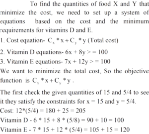 The constraint 7x + 12y ≥ 120 implies that the total units of vitamin E from food X and Y combined must be greater than or equal to 120, which is also correct as it meets the minimum requirement of 120 units. Therefore, the constraints 6x + 8y ≥ 100,