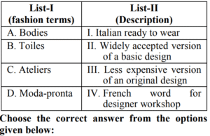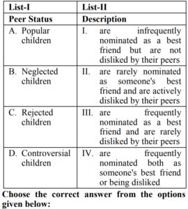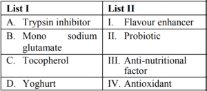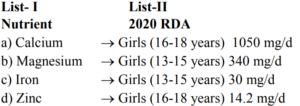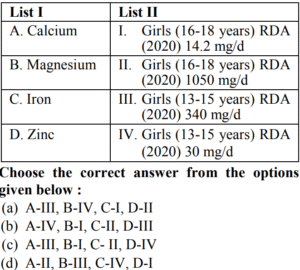 UGC NET/JRF EXAM, December 2021/June 2022 Paper -II (HOME SCIENCE)Total Questions: 10061. Power of a test isA. ability to detect the real effect in a population based on a sample taken from the population B. Probability of correctly rejecting null hypothesis when it is true C. increased when sample size increases D. Probability of correctly rejecting null hypothesis when it is false E. decreased when sample size increases Choose the correct answer from the options given below:(a) A, B and E only(b) B, D and E only(c) A, C and D only(d) A, B and D onlyCorrect Answer: (c) A, C and D onlySolution:Power of test is :- • Ability to detect the real effect in a population based on a sample taken from the population. • Increased when sample size increases • Probability of correctly rejecting null hypothesis when it is false.62. Match List I with List II(a)(b)(c)(d)Correct Answer: (d)Solution:63. Match List I with List II Choose the correct answer from the options given below:(a) A-II, B-III, C-IV, D-I(b) A-III, B-IV, C-I, D-II(c) A-III, B-I, C-IV, D-II(d) A-II, B-IV, C-I, D-IIICorrect Answer: (c) A-III, B-I, C-IV, D-IISolution:64. Match List I with List II(a) A-II, B-IV, C-I, D-III(b) A-II, B-III, C-IV, D-I(c) A-III, B-II, C-I, D-IV(d) A-II, B-I, C-III, D-IVCorrect Answer: (b) A-II, B-III, C-IV, D-ISolution:65. Match List-I with List-II(a) A-II, B-IV, C-I, D-III(b) A-II, B-III, C-IV, D-I(c) A-I, B-III, C-II, D-IV(d) A-II, B-IV, C-III, D-ICorrect Answer: (b) A-II, B-III, C-IV, D-ISolution:66. Match List-I with List-II(a) A-IV, B-V, C-II, D-III, E-I(b) A-V, B-I, C-III, D-II, E-IV(c) A-IV, B-V, C-I, D-II, E-III(d) A-I B-III, C-II, D-V, E-IVCorrect Answer: (b) A-V, B-I, C-III, D-II, E-IVSolution:67. Match List I with List II(a) A-IV, B-I, C-II, D-III(b) A-I, B-II, C-III, D-IV(c) A-IV, B-I, C-III, D-II(d) A-II, B-III, C-IV, D-ICorrect Answer: (a) A-IV, B-I, C-II, D-IIISolution:68. Match List I with List II(a) A-I, B-II, C-IV, D-III(b) A-II, B-I, C-III, D-IV(c) A-IV, B-III, C-I, D-II(d) A-III, B-I, C-II, D-IVCorrect Answer: (d) A-III, B-I, C-II, D-IVSolution:69. Match List I with List II (a) A-III, B-IV, C-I, D-II(b) A-II, B-I, C-IV, D-III(c) A-I, B-II, C-III, D-IV(d) A-IV, B-III, C-II, D-ICorrect Answer: (b) A-II, B-I, C-IV, D-IIISolution:70. Match List I with List II(a) A-V, B-II, C-III, D-I(b) A-IV, B-I, C-V, D-II(c) A-IV, B-I, C-III, D-II(d) A-V, B-I, C-II, D-IVCorrect Answer: (c) A-IV, B-I, C-III, D-IISolution:Submit Quiz« Previous12345678910Next »