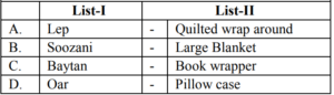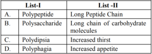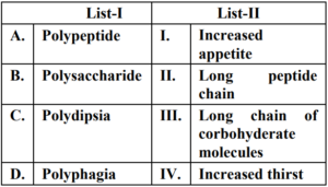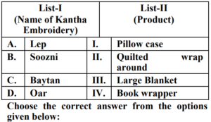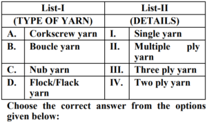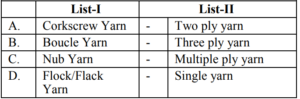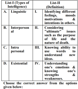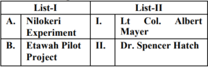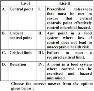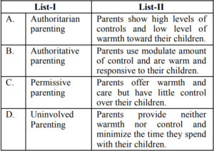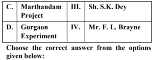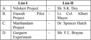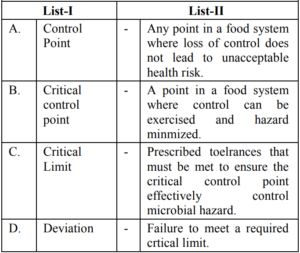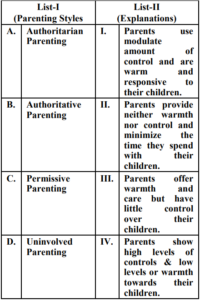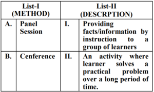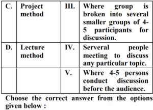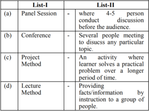 UGC NET/JRF EXAM, December 2022 Paper II (HOME SCIENCE)Total Questions: 10061. Quasi experimental designs can be:A. Non Equivalent groups design B. Non-Cohort design C. Equivalent groups design D. Cohort design E. True experiment design Choose the correct answer from the options given below:(a) B & E Only(b) C & E Only(c) A & D Only(d) A & B OnlyCorrect Answer: (c) A & D OnlySolution:The quasi experimental research is not true experimental deisgn. Because the independent variable is manipulated to observe the effect on dependent variable. Quasi experimental design can be non-equivalent design. The non-equivalent control group design is effective at researching groups that already exists in the population. It can be cohort design.62. Match List-I with List-II Choose the correct answer from the options given below :(a) A-III, B-IV, C-I, D-II(b) A-IV, B-I, C-II, D-III(c) A-II, B-III, C-IV, D-I(d) A-II, B-I, C-IV, D-IIICorrect Answer: (c) A-II, B-III, C-IV, D-ISolution:63. Match List-I with List-II(a) A-II, B-III, C-IV, D-I(b) A-III, B-IV, C-II, D-I(c) A-IV, B-I, C-II, D-III(d) A-II, B-IV, C-I, D-IIICorrect Answer: (d) A-II, B-IV, C-I, D-IIISolution:64. Match List-I with List-II(a) A-IV, B-III, C-II, D-I(b) A-I, B-II, C-III, D-IV(c) A-II, B-III, C-IV, D-I(d) A-III, B-IV, C-I, D-IICorrect Answer: (a) A-IV, B-III, C-II, D-ISolution:65. Match List-I with List-II(a) A-II, B-I, C-III, D-IV(b) A-II, B-III, C-IV, D-I(c) A-III, B-II, C-IV, D-I(d) A-IV, B-I, C-III, D-IICorrect Answer: (b) A-II, B-III, C-IV, D-ISolution:66. Match List-I with List-II(a) A-I, B-II, C-III, D-IV(b) A-II, B-IV, C-I, D-V(c) A-V, B-IV, C-I, D-III(d) A-V, B-IV, C-II, D-ICorrect Answer: (d) A-V, B-IV, C-II, D-ISolution:67. Match List-I with List-II(a) A-II, B-III, C-V, D-VI, E-IV, F-I(b) A-I, B-II, C-III, D-IV, E-V, F-VI(c) A-II, B-V, C-VI, D-III, E-I, F-IV(d) A-VI, B-IV, C-I, D-II, E-III, F-V(e)*Correct Answer: (e)*Solution:68. Match List-I with List-II(a) A-I, B-II, C-III, D-IV(b) A-III, B-I, C-IV, D-II(c) A-IV, B-III, C-II, D-I(d) A-I, B-III, C-II, D-IVCorrect Answer: (b) A-III, B-I, C-IV, D-IISolution:69. Match List-I with List-II Choose the correct answer from the options given below:(a) A-I, B-III, C-II, D-IV(b) A-II, B-I, C-III, D-IV(c) A-IV, B-III, C-II, D-I(d) A-IV, B-I, C-III, D-IICorrect Answer: (d) A-IV, B-I, C-III, D-IISolution:70. Match List-I with List-II Initiatives of Extension Programmes in India. (a) A-III, B-I, C-II, D-IV(b) A-I, B-III, C-II, D-IV(c) A-II, B-I, C-IV, D-III(d) A-IV, B-II, C-I, D-IIICorrect Answer: (a) A-III, B-I, C-II, D-IVSolution:Submit Quiz« Previous12345678910Next »