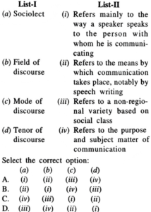 UGC-NET (NTA) Linguistics, June-2019Total Questions: 10061. When ........... is used to conceal the activities of a people such as criminals, it may be called argot.A. tabooB. euphemismC. slangD. vernacularCorrect Answer: C. slang62. Which of the following tools is most frequently used in computational linguistics to gather huge data from the 'web' for creating big linguistic corpora for natural language processing?A. WebcrawlerB. WikipediaC. UnicodeD. ThinktankCorrect Answer: A. Webcrawler63. Which among the following are used quite frequently in the language of advertisements?A. VerbsB. PrepositionsC. AdjectivesD. PronounsCorrect Answer: C. Adjectives64. "It is most sane and sunly and more it cannot die"In the given verse, the word 'sunly' is an example of:A. analogyB. parallelismC. neologismD. metonymyCorrect Answer: C. neologism65. A change in the meaning of a word so that it comes to include additional senses which were not originally present but which are closely associated with the word's original meaning, is referred to by:A. synecdocheB. metonymyC. word blendD. ameliorationCorrect Answer: B. metonymy66. The uniformity and rapidity of first language acquisition is explained by Chomsky's postulate of a biologically endowed language faculty as it is considered to determine one of the following:A. nature of linguistic experienceB. functions of languageC. structure of wordsD. the course of acquisitionCorrect Answer: D. the course of acquisition67. Match List-I with List-II:A.B.C.D.Correct Answer: D.68. Which of the following is NOT true about pragmatics?A. It is the study of speaker' meaningB. It recognizes what is meant when it isn't actually said or writtenC. Speakers (or writers) must be able to depend on a lot of shared assumptions and expectationsD. It deals with the conventional meaning conveyed by use of words, phrases and sentences of a languageCorrect Answer: D. It deals with the conventional meaning conveyed by use of words, phrases and sentences of a language69. Which of the following is a cover term for devices which allow. speakers to express varying degrees of commitment to, or belief, in a proposition?A. EvidentialityB. RelativityC. ModalityD. FunctionalityCorrect Answer: C. Modality70. Implosives are made with:A. eggressive glottalic airstreamB. ingressive glottalic airstreamC. ingressive velaric airstreamD: eggressive velaric airstreamCorrect Answer: B. ingressive glottalic airstreamSubmit Quiz« Previous12345678910Next »
