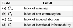 UGC-NET (NTA) POPULATION STUDIES, June-2020Total Questions: 10061. In order to calculate sample size for prevalance study, which of the following information are required?(a) Prevalence rate from previous studies (b) Allowable error (c) Level of Significance (d) Population of the area (e) Standard deviation of parameter under study Choose the correct answer from the options given below:A. (a), (b), (c) onlyB. (a), (b), (c), (d) onlyC. (a), (b), (c), (e) onlyD. (b), (c), (d), (e) onlyCorrect Answer: A. (a), (b), (c) only62. Match List-I with List-II.List-IList-II(a) International Women’s day(i) 21 June(b) World Environment day(ii) 8 March(c) World Population day(iii) 5 June(d) International Yoga day(iv) 11 JulyChoose the correct answer from the options given below: Codes: (a)(b)(c)(d)A(ii)(iii)(iv)(i)B(ii)(iii)(i)(iv)C(iii)(ii)(iv)(i)D(iii)(ii)(i)(iv)A.B.C.D.Correct Answer: A.63. Match List-I with List-II.List-I (Quality of Data)List-II (Range of Whipple’s Index)(a) Highly accurate(i) 195–175(b) Fairly accurate(ii) 105–110(c) Approximate(iii) 110–125(d) Rough(iv) under 105Choose the correct answer from the options given below: Codes: (a)(b)(c)(d)A(iv)(ii)(iii)(i)B(iv)(iii)(ii)(i)C(iii)(iv)(i)(ii)D(iii)(iv)(ii)(i)A.B.C.D.Correct Answer: A.64. Match List-I with List-II.List-IList-II(a) Linear growth function(i) pₜ = k / (1 − e^(a+bt))(b) Exponential growth function(ii) pₜ = p₀ (1 + r)ᵗ(c) Geometric growth function(iii) pₜ = p₀ (1 + rt)(d) Logistic curve(iv) pₜ = p₀ e^(rt)Choose the correct answer from the options given below: Codes: (a)(b)(c)(d)A(ii)(iii)(iv)(i)B(iii)(iv)(ii)(i)C(iii)(i)(ii)(iv)D(i)(iv)(iii)(ii)A.B.C.D.Correct Answer: B.65. Match List-I with List-II.List-IList-II(a) Temporary absence of menstruation(i) Fecundity(b) Onset of menstruation(ii) Amenorrhea(c) Physical capacity to reproduce(iii) Menopause(d) End of menstruation(iv) MenarcheChoose the correct answer from the options given below: Codes: (a)(b)(c)(d)A(ii)(iv)(i)(iii)B(iii)(iv)(i)(ii)C(iv)(iii)(ii)(i)D(iv)(i)(iii)(ii)A.B.C.D.Correct Answer: A.66. Match List-I with List-II.List-IList-II(a) Child Marriage Restraint Act(i) 1929(b) Domestic Violence Act(ii) 1986(c) Child Labour Prohibition Act(iii) 1971(d) Medical Termination of Pregnancy Act(iv) 2005Choose the correct answer from the options given below: Codes: (a)(b)(c)(d)A(i)(iv)(ii)(iii)B(ii)(i)(iii)(iv)C(iii)(i)(ii)(iv)D(iv)(ii)(iii)(i)A.B.C.D.Correct Answer: A.67. Match List-I with List-II.List-IList-II(a) Major employment centre in a region and encompassing surrounding areas(i) The urban field(b) Built-up area formed by coalescence of once-separate urban settlements(ii) Ecumenopolis(c) A core urban area and hinterland of population(iii) Conurbation(d) Projected urbanised world or universal city by end of 21st century(iv) The City RegionChoose the correct answer from the options given below: Codes: (a)(b)(c)(d)A(iv)(iii)(i)(ii)B(iii)(i)(iv)(ii)C(iv)(ii)(iii)(i)D(iii)(i)(ii)(iv)A.B.C.D.Correct Answer: A.68. Match List-I with List-II.List-I (Description)List-II (Life table function)(a) Number of survivors at exact age x(i) lₓ+5 / lₓ(b) Number of person-years lived in the exact age x(ii) Lₓ(c) Probability of survival between age x to x + 5(iii) Tₓ / lₓ(d) Expectation of life at age x(iv) lₓChoose the correct answer from the options given below: Codes: (a)(b)(c)(d)A(i)(ii)(iii)(iv)B(ii)(i)(iii)(iv)C(iv)(ii)(i)(iii)D(iv)(iii)(ii)(i)A.B.C.D.Correct Answer: C.69. Match List-I with List-II. Choose the correct answer from the options given below: Codes:(a)(b)(c)(d)A(iii)(i)(iv)(ii)B(ii)(iii)(i)(iv)C(iv)(i)(ii)(iii)D(iii)(iv)(ii)(i)A.B.C.D.Correct Answer: D.70. Match List-I with List-II.List-IList-II(a) Individual decision and human capital(i) Peggy Levitt(b) Social remittances(ii) Wilbur Zelinski(c) Mobility transition(iii) Larry Sjaastad(d) Dual Labour market(iv) M.J. PioreChoose the correct answer from the options given below: Codes: (a)(b)(c)(d)A(i)(ii)(iii)(iv)B(i)(iv)(ii)(iii)C(iii)(ii)(i)(iv)D(iii)(i)(ii)(iv)A.B.C.D.Correct Answer: D.Submit Quiz« Previous12345678910Next »