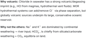 Circulating sea water through porous volcanic rocks not only cools the lithosphere but also contribute to the sea water chemistry, and formation of important mineral deposits of Co, Ni, Lanthanides and PGEs. Continental weathering also contributes to the seawater composition.