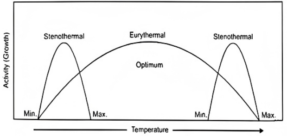 For example, a stenothermal organism will mean that the organism can tolerate only a narrow range of temperature. With narrow range of tolerance, organisms are concentrated at either end of the curve; having the optimum, minimum and maximum in a very narrow range.