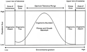 Solution:The tolerance curve is a measure of organism's fitness and survival. A bell shaped curve results when measures of survival or fitness are plotted against the environmental gradient (Fig. 1). Those environmental conditions under which an organism grows and reproduces maximally comprise the optimum range.