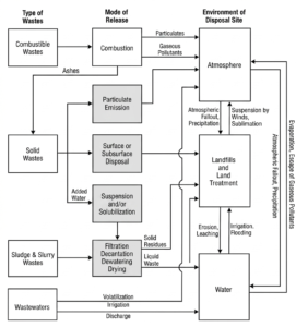 The four major waste types based on physical characteristics combustible wastes, solid wastes, sludge and slurry wastes, and wastewaters-are presented in Figure, which shows how each of these types can eventually release pollutants into the atmospheric, terrestrial, and aquatic environments.