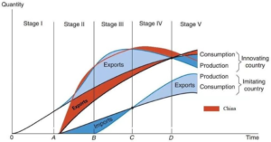 The product cycle model by Raymond Vernon which explains how a product evolves through stages and how international trade patterns shift:In stage I (time OA), the product is produced and consumed only in the innovating country.