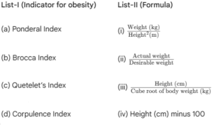 UGC NTA NET/JRF Exam, Social Medicine & Community Health, June-2020Total Questions: 10071. Match List-I with List-II:List-I (Malariometric indices related to human host)List-II (Interpretation) (a) Hypoendemic(i) Spleen rate or parasite rate consistently over 75%(b) Mesoendemic(ii) Spleen rate or parasite rate of 0–10%(c) Hyperendemic(iii) Spleen rate or parasite rate consistently over 50%(d) Holoendemic(iv) Spleen rate or parasite rate of 11–50%Choose the correct answer from the options given below: (a)(b)(c)(d)A.(iii)(i)(ii)(iv)B.(iv)(iii)(i)(ii)C.(ii)(iv)(iii)(i)D.(iv)(i)(ii)(iii)А.В.C.D.Correct Answer: C.72. Match List-I with List-II:Choose the correct answer fron the options given below: (a)(b)(c)(d)A.(iii)(ii)(iv)(i)B.(ii)(iv)(iii)(i)C.(iv)(ii)(i)(iii)D.(iii)(iv)(i)(ii)A.B.C.D.Correct Answer: D.73. Match List-I with List-II:List-IList-II(a) Crowd(i) A social group determined by geographical boundaries and/or common values and interest(b) Mob(ii) A large group of people gathered in one place(c) Society(iii) A large group, fairly unified and single minded in its aggressive intent(d) Community(iv) An organization of member agents following a system of social relationship between individualsChoose the correct answer from the options given below: (a)(b)(c)(d)A.(ii)(iii)(iv)(i)B.(iii)(ii)(i)(iv)C.(ii)(iv)(iii)(i)D.(i)(ii)(iii)(iv)A.B.C.D.Correct Answer: A.74. Match List-I with List-II:List-IList-II(a) Epornithic(i) Infections transmitted from vertebrate animals to man(b) Anthropozoonoses(ii) Infection transmitted from man to vertebrate animals(c) Amphixenosis(iii) An outbreak of disease in bird population(d) Zooanthroponoses(iv) Infection is transmitted in both man and lower vertebrate in either directionChoose the correct answer from the options given below: (a)(b)(c)(d)A.(i)(ii)(iii)(iv)B.(ii)(iii)(iv)(i)C.(iii)(i)(iv)(ii)D.(iv)(ii)(iii)(i)A.B.C.D.Correct Answer: C.75. Match List-I with List-II: List-I (Terms)List-II (Definitions)(a) Community Health(i) "Steps decided upon to meet the health needs of the community taking into account the resources available and the wishes of the people"(b) Community Medicine(ii) "All the personal health and environmental services in any human community, irrespective of whether such services were public or private ones"(c) Community Diagnosis(iii) "The study of Health and Disease in the population of a defined Community or Group"(d) Community Treatment(iv) "The pattern of a disease in a community described in terms of the important factors which influence this pattern"Choose the correct answer from the options given below: (a)(b)(c)(d)A.(iii)(i)(iv)(ii)B.(iv)(i)(ii)(iii)C.(ii)(iii)(iv)(i)D.(iii)(iv)(i)(ii)A.B.C.D.Correct Answer: C.76. Arrange the steps involved in the investigation of an epidemic:(a) Defining the population at risk (b) Verification of diagnosis (c) Confirmation of the existence of an epidemic (d) Rapid search of all cases Choose the correct answer from the options given below:A. (c), (d), (a), (b)B. (a), (b), (c), (d)C. (b), (c), (a), (d)D. (c), (a), (d), (b)Correct Answer: C. (b), (c), (a), (d)77. Arrange the following South East Asian Region Countries, according to their Joining to World Health Organization (WHO) in Chronological Order:(a) Nepal (b) Thailand (c) Indonesia (d) Sri Lanka Choose the correct answer from the options given below:A. (b), (a), (d), (c)B. (b), (a), (c), (d)C. (b), (c), (a), (d)D. (b), (d), (c), (a)Correct Answer: D. (b), (d), (c), (a)78. Arrange the steps involved in purification of water by rapid sand filter method:(a) Flocculation (b) Filtration (c) Back Washing (d) Coagulation Choose the correct answer from the options given below:A. (d), (a), (b), (c)В. (a), (d), (b), (c)C. (b), (a), (c), (d)D. (d), (c), (a), (b)Correct Answer: A. (d), (a), (b), (c)79. Arrange the following immunization milestones in chronological sequence from remote past to most recent.(a) Universal Immunization Programme (b) Tetanus Toxoid vaccine for pregnant women (c) Expanded programme of immunization (d) Vit-A supplementation Choose the correct answer from the options given below:A. (d), (a), (c), (b)B. (b), (d), (a), (c)C. (a), (c), (d), (b)D. (c), (b), (a), (d)Correct Answer: D. (c), (b), (a), (d)80. Arrange the following causes of blindness according to their burden from lowest to highest:(a) Glaucoma (b) Cataract (c) Refractive Error (d) Surgical Complications Choose the correct answer from the options given below: A. (a), (c), (b), (d)B. (b), (a), (c), (d)C. (d), (c), (b), (a)D. (d), (a), (c), (b)Correct Answer: D. (d), (a), (c), (b)Submit Quiz« Previous12345678910Next »