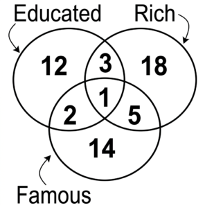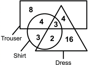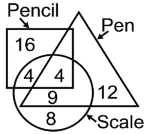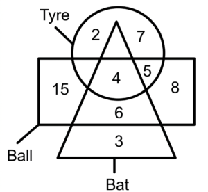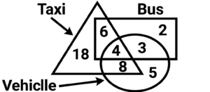 Venn Diagram (SSC REASONING) Part-2Total Questions: 5031. What is the total number of buses ? [SSC CHSL 09/03/2023 (3rd Shift)](a) 13(b) 14(c) 15(d) 7Correct Answer: (c) 15Solution:From the venn diagram we can say that the total number of buses is (6 + 4 + 3 + 2) = 15.32. How many pens are there? [SSC CHSL 09/03/2023 (4th Shift) ](a) 21(b) 16(c) 20(d) 25Correct Answer: (d) 25Solution:Total number of pens = 12 + 4 + 9 = 2533. How many glass are both phone and pen? [SSC CHSL 10/03/2023 (1st Shift) ](a) 13(b) 24(c) 11(d) 15Correct Answer: (c) 11Solution:From the venn diagram we can say that the number of glass which are both phone and pen = 1134. Study the given diagram carefully and answer the questions. The numbers in different sections indicate the number of persons. [SSC CHSL 10/03/2023 (2nd Shift) ](a) 2(b) 5(c) 3(d) 1Correct Answer: (c) 3Solution:People that are educated and rich but not famous = 335. How many black table are there ? [SSC CHSL 10/03/2023 (3rd Shift) ](a) 9(b) 8(c) 7(d) 14Correct Answer: (d) 14Solution:By looking at the venn diagram we can say that the number of black tables are = 5 + 4 + 2 + 3 = 1436. Mothers, Husbands and Males [SSC CHSL 10/03/2023 (4th Shift)](a)(b)(c)(d)Correct Answer: (c)Solution:37. How many balls are neither bat nor tyre? [SSC CHSL 13/03/2023 (1st Shift) ](a) 15(b) 21(c) 23(d) 8Correct Answer: (c) 23Solution:From the venn diagram we can say that number of balls which are neither bat nor tyre = 15 + 8 = 2338. How many dresses are trousers ? [SSC CHSL 13/03/2023 (3rd Shift) ](a) 5(b) 7(c) 4(d) 3Correct Answer: (b) 7Solution:The correct answer is 7.39. How many register are neither tools nor sword ? [SSC CHSL 13/03/2023 (4th Shift) ](a) 24(b) 18(c) 15(d) 25Correct Answer: (b) 18Solution:register that are neither tools nor sword = 1840. Indians, Brain specialist, Surgeon [SSC CHSL 14/03/2023 (2nd Shift)](a)(b)(c)(d)Correct Answer: (c)Solution:Submit Quiz« Previous12345Next »