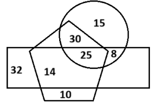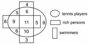 Venn Diagram (SSC REASONING) Part-4Total Questions: 5021. In the given diagram, the shapes indicate the categories of persons. The numbers given in the different segments separate the number of person in that category. [SSC CHSL 15/04/2021 (Afternoon) ](a) 15(b) 22(c) 19(d) 11Correct Answer: (c) 19Solution:Dancer who are gymnast = 3 + 7 = 10 Dancer who are singer = 9 Total dancers who are either gymnasts or singers but not both = 10 + 9 = 1922. In the given diagram, the shapes indicate the categories of persons. The numbers given in the different segments represent the number of persons in that category. [SSC CHSL 16/04/2021 (Morning) ](a) 30(b) 26(c) 24(d) 41Correct Answer: (a) 30Solution:Tennis Player who are only swimmer = 6 + 10 = 16 Tennis Player who are only rich person = 9 + 5 = 14 Tennis player who are either swimmer or rich person but not both = 14 + 16 = 3023. Telugu, Urdu, Poetry [SSC CHSL 19/04/2021 (Afternoon)](a)(b)(c)(d)Correct Answer: (d)Solution:Urdu and Telugu have nothing in common as both are entirely different languages but poetry can be done in both the languages so it is common to both the languages.24. Women, Gynecologist, Doctors [SSC CHSL 19/04/2021 (Evening)](a)(b)(c)(d)Correct Answer: (a)Solution:Gynaecologist is necessarily a doctor but not sure about gender (can be male or female).25. Teachers, Graduates, Tennis players [SSC CHSL 04/08/2021 (Evening)](a)(b)(c)(d)Correct Answer: (c)Solution:26. Statisticians, Men, Pathologists [SSC CHSL 05/08/2021 (Morning)](a)(b)(c)(d)Correct Answer: (b)Solution:27. In the Venn diagram given below, if ‘Hexagon’ represents ‘Farmers’, ‘Triangle’ represents ‘Villagers’ and ‘Square’ represents ‘Beneficiaries’, then how many Farmers are there who are Villagers and Beneficiaries also? [SSC CHSL 05/08/2021 (Evening) ](a) 9(b) 18(c) 11(d) 5Correct Answer: (d) 5Solution:Farmers are there who are both Villagers and Beneficiaries are represented by the area that is common in all the three shapes which is 5.28. In the given diagram, the shapes indicate the categories of persons. The number given in the different segments represent the number of persons in that category [SSC CHSL 06/08/2021 (Afternoon) ](a) 39(b) 40(c) 35(d) 41Correct Answer: (a) 39Solution:Females either graduates or employed but NOT both, are represented by circle + triangle and circle + square but not all three. So, 9 + 12 + 18 = 39.29. In the following Venn diagram, the pentagon stands for ‘Librarians’, the rectangle stands for ‘Income tax payers’, and the circle stands for ‘Post-graduates’. The given number represents the number of persons in that particular category. [SSC CHSL 06/08/2021 (Evening) ](a) 14(b) 55(c) 30(d) 25Correct Answer: (b) 55Solution:librarians are there who are also post graduates are represented by the common area of circle and pentagon. So, 25 + 30 = 55.30. Books, Library, Chapter , Index [SSC CHSL 09/08/2021 (Morning)](a)(b)(c)(d)Correct Answer: (c)Solution:Books are found in the library Chapter and index both are found inside the book but are totally different from each other. So option (c) follows.Submit Quiz« Previous12345Next »