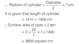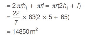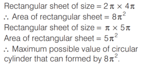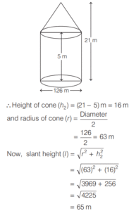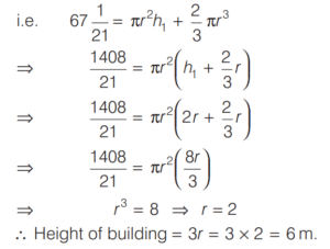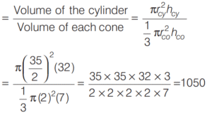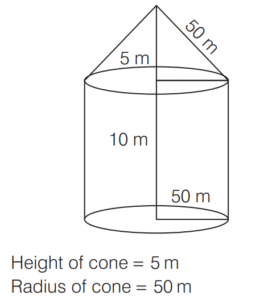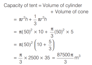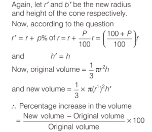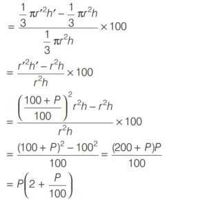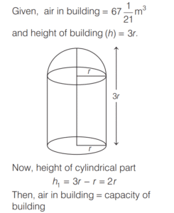 VOLUME AND SURFACE AREA (CDS)Total Questions: 10641. A tent has been constructed which is in the form of right circular cylinder surmounted by a right circular cone whose axis coincides with the axis of the cylinder. If the radius of the base of the cylinder is 50 m, the height of the cylinder is 10 m and the total height of he tent is 15 m, then what is the capacity of the tent is cubic metres? [2017 (II) Evening Shift](a) 37500 π(b) 87500π/3(c) 36500π/3(d) 25000 πCorrect Answer: (b) 87500π/3Solution:We have, height of cylinder = 10 m 42. Two rectangular sheets of sizes of 2π × 4π and π × 5× are available. A hollow right circular cylinder can be formed by joining a pair of parallel sides of any sheet. What is the maximum possible volume of that circular cylinder that can be formed this way? [2017 (II) Evening Shift](a) 4π²(b) 8π²(c) 1.25π²(d) 6.25π²Correct Answer: (b) 8π²Solution:We have,43. A ball of radius 1 cm is put into a cylindrical pipe so that it fits inside the pipe. If the length of the pipe is 14 m, what is the surface area of the pipe? [2017 (I) Morning Shift](a) 2200 square cm(b) 4400 square cm(c) 8800 square cm(d) 17600 square cmCorrect Answer: (c) 8800 square cmSolution:Diameter of the cylinder = Diameter of spherical ball = 2 cm44. If the radius of a right circular cone is increased by p% without increasing its height, then what is the percentage increase in the volume of the cone? [2017 (I) Morning Shift](a)(b)(c)(d)Correct Answer: (d)Solution:Let r and h be the original radius and height of the cone respectively. 45. If the surface area of a sphere is reduced to one ninth of the area, its radius reduces to [2017 (I) Morning Shift](a) One-fourth(b) One-third(c) One-fifth(d) One-ninthCorrect Answer: (b) One-thirdSolution:Let original and new radius of the sphere are r and r′ respectively.46. Ice-cream, completely filled in a cylinder of diameter 35 cm and height 32 cm, is to be served by completely filling identical disposable cones of diameter 4 cm and height 7 cm. The maximum number of persons that can be served in this way is [2017 (I) Morning Shift](a) 950(b) 1000(c) 1050(d) 1100Correct Answer: (c) 1050Solution:Number of persons47. (Questions 47-49) A tent of a circus is made of canvas and is in the form of right circular cylinder and right circular cone above it. The height and diameter of the cylindrical part of the tent are 5m and 126 m, respectively. The total height of the tent is 21 m. [2016 (II) Evening Shift]What is the slant height of the cone?(a) 60 m(b) 65 m(c) 68 m(d) 70 mCorrect Answer: (b) 65 mSolution:Given, height of tent = 21m and height of cylindrical part (h₁) = 5 m48. What is the curved surface area of the cylinder? [2016 (II) Evening Shift](a) 1980 m²(b) 2010 m²(c) 2100 m²(d) 2240 m²Correct Answer: (a) 1980 m²Solution:Curved surface area of the cylinder= 2πrh₁ = 2 × 22/7 × 63 × 5 = 1980m²49. How many square metres of canvas are used? [2016 (II) Evening Shift](a) 14450(b) 14480(c) 14580(d) 14850Correct Answer: (d) 14850Solution:Total canvas used = Curved surface area of cylinder + Curved surface area of cone50. A building is in the form of a cylinder surmounted by a hemispherical dome on the diameter of the cylinder. The height of the building is three times the radius of the base of the cylinder. The building contains 67¹⁄₂₈ of air. What is the height of the building? [2016 (II) Evening Shift](a) 6 m(b) 4 m(c) 3 m(d) 2 mCorrect Answer: (a) 6 mSolution:Let r be the radius of the cylinder. Submit Quiz« Previous1234567891011Next »