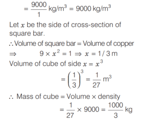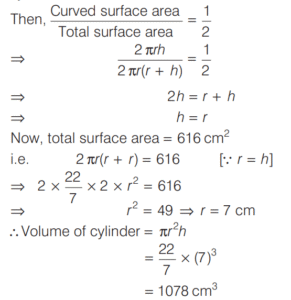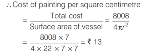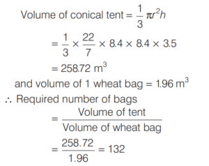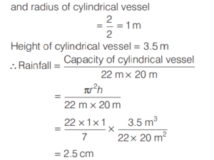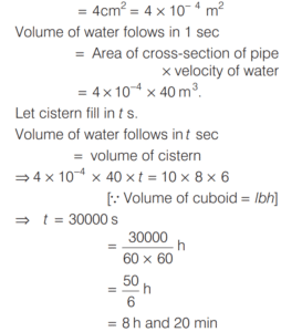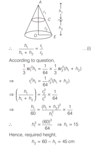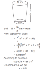 VOLUME AND SURFACE AREA (CDS)Total Questions: 10651. The radius of the base and the height of a solid right circular cylinder are in the ratio 2 : 3 and its volume is 1617 cm 3 . What is the total surface area of the cylinder? [2016 (II) Evening Shift](a) 462 cm²(b) 616 cm²(c) 770 cm²(d) 786 cm²Correct Answer: (c) 770 cm²Solution:Let radius of the base be 2x. Height of the cylinder be 3x and volume = 1617 cm³. 52. The cost of painting a spherical vessel of diameter 14 cm is ₹8008. What is the cost of painting per square centimetre? [2016 (II) Evening Shift](a) ₹8(b) ₹9(c) ₹13(d) ₹14Correct Answer: (c) ₹13Solution:Given, diameter of vessel is 14 cm and cost of painting is ₹8008.53. A drinking glass of height 24 cm is in the shape of frustum of a cone and diameters of its bottom and top circular ends are 4 cm and 18 cm respectively. If we take capacity of the glass as πx cm³, then what is the value of x? [2016 (II) Evening Shift](a) 824(b) 1236(c) 1628(d) 2472Correct Answer: (a) 824Solution:Here, h = 24 cm, r = 4/2 cm = 2 cm54. Rain water from a roof of 22m × 20m drains into a cylindrical vessel having diameter of base 2m and height 3.5 m. If the vessel is just full, what is the rainfall? [2016 (II) Evening Shift](a) 3.5 cm(b) 3 cm(c) 2.5 cm(d) 2 cmCorrect Answer: (c) 2.5 cmSolution:Given, area of roof = length × breadth = 22m × 20m55. The height of a cone is 60 cm. A small cone is cut off at the top by a plane parallel to the base and its volume is 1/64 the volume of original cone. What is the height from the base at which the section is made? [2016 (II) Evening Shift](a) 15 cm(b) 20 cm(c) 30 cm(d) 45 cmCorrect Answer: (d) 45 cmSolution:In ∆AOE and ∆ADC, ∵ ∆AOE ∼ ∆ADC56. The ratio of the curved surface area to the total surface area of a right circular cylinder is 1 : 2. If the total surface area is 616 cm², what is the volume of the cylinder? [2016 (II) Evening Shift](a) 539 cm³(b) 616 3 cm³(c) 1078 cm³(d) 1232 cm³Correct Answer: (c) 1078 cm³Solution:Let r and h be the radius and height of cylinder.57. A cubic metre of copper weighing 9000 kg is rolled into a square bar 9 m long. An exact cube is cut off from the bar. How much does the cube weigh? [2016 (II) Evening Shift](a) 1000 kg(b) 1000/3 kg(c) 300 kg(d) 500/3 kgCorrect Answer: (b) 1000/3 kgSolution:Density of copper = Mass/Volume58. Into a conical tent of radius 8.4 m and vertical height 3.5 m, how many full bags of wheat can be emptied, if space required for the wheat in each bag is 1.96 m³ ? [2016 (II) Evening Shift](a) 264(b) 201(c) 132(d) 105Correct Answer: (c) 132Solution:59. A pipe with square cross-section is supplying water to a cistern which was initially empty. The area of cross-section is 4 cm2 and the nozzle velocity of water is 40m/s. The dimensions of the cistern 10m × 8m × 6m. Then, the cistern will be full in [2015 (II) Evening Shift](a) 9.5 h(b) 9 h(c) 8 h and 20 min(d) 8 hCorrect Answer: (c) 8 h and 20 minSolution:We have, area of cross-section of pipe60. A hollow cylindrical drum has internal diameter of 30 cm and a height of 1 m. What is the maximum number of cylindrical boxes of diameter 10 cm and height 10 cm each that can be packed in the drum? [2015 (II) Evening Shift](a) 60(b) 70(c) 80(d) 90Correct Answer: (d) 90Solution:Let n cylindrical boxes be packed n ⋅ π × 5 × 5 × 10 = π × 15 × 15 × 100 ∴ n = 90 boxesSubmit Quiz« Previous1234567891011Next »