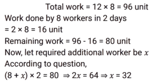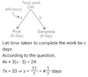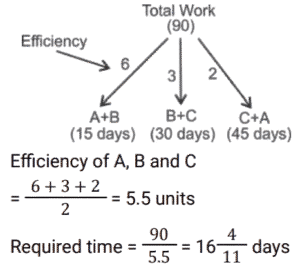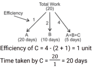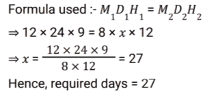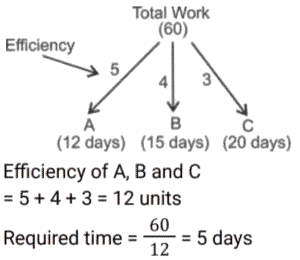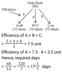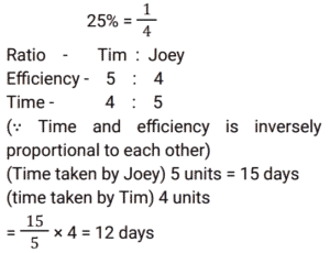 Work and Time (SSC) (Part-2)Total Questions: 5011. Twelve men working for 9 hours a day complete a piece of work in 24 days. In how many days can 8 men working for 12 hours a day complete the same piece of work? [SSC CHSL 02/07/2024 (1st Shift)](a) 28(b) 27(c) 24(d) 21Correct Answer: (b) 27Solution:12. 47 masons can dig a 35 m long trench in one day. How many masons should be employed for digging a 105 m long trench of the same type in one day? [SSC CHSL 02/07/2024 (2nd Shift)](a) 94(b) 70(c) 141(d) 128Correct Answer: (c) 141Solution:13. A, B and C can complete a work in 12, 15 and 20 days, respectively. How many days are required to finish the work if they work together? [SSC CHSL 02/07/2024 (4th Shift)](a) 4(b) 3(c) 5(d) 6Correct Answer: (c) 5Solution:14. Joey completed the school project in 15 days. How many days will Tim take to complete the same work if he is 25% more efficient than Joey? [SSC CHSL 03/07/2024 (1st Shift)](a) 12(b) 16(c) 8(d) 10Correct Answer: (a) 12Solution:15. 18 men can complete 1/5 of a work in 10 days. How many people are required to complete 2/5 of the same work in 5 days? [SSC CHSL 03/07/2024 (2nd Shift)](a) 72(b) 90(c) 36(d) 54Correct Answer: (a) 72Solution:16. A and B can complete a piece of work in 12 days. B and C can complete the same work in 15 days and C and A in 10 days. How many days will A take to complete the work by himself? [SSC CHSL 03/07/2024 (3rd Shift)](a)(b)(c)(d)Correct Answer: (c)Solution:17. Riya and Sangeeta can finish a work in 6 days and 8 days, respectively. Riya started the work alone and then after 3 days, Sangeeta joined Riya. They both finish the remaining work. How long did the total work last ? [SSC CHSL 03/07/2024 (4th Shift)](a)(b)(c)(d)Correct Answer: (d)Solution:18. A and B can complete a piece of work in 15 days. B and C in 30 days and C and A in 45 days. In how many days will they complete the work if they start working together? [SSC CHSL 04/07/2024 (1st Shift)](a)(b)(c)(d)Correct Answer: (a)Solution:19. A can complete a piece of work in 20 days and B can complete the same work in 10 days. With the help of C, working together they completed the work in 5 days. The number of days in which C alone can complete the work is: [SSC CHSL 04/07/2024 (2nd Shift)](a) 20(b) 25(c) 10(d) 15Correct Answer: (a) 20Solution:20. To finish a work in 12 days, 8 workers are engaged. After 2 days, due to some urgency, the work is to be finished in next 2 days. How many more workers are to be engaged now to finish it on time? [SSC CHSL 04/07/2024 (3rd Shift)](a) 36(b) 32(c) 40(d) 30Correct Answer: (b) 32Solution:Submit Quiz« Previous12345Next »