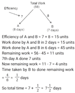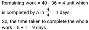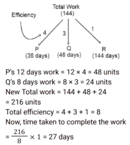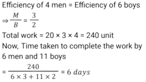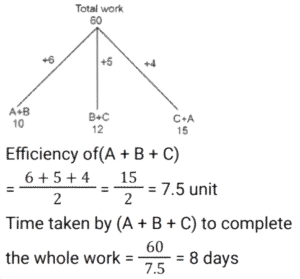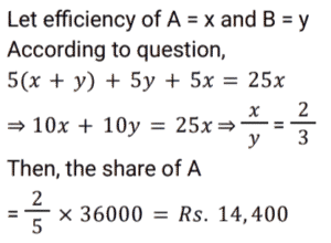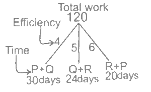 Work and Time (SSC) (Part-3)Total Questions: 5021. A and B can do a piece of work in 10 days. B and C can do the same work in 12 days. C and A can do the same work in 15 days. If all the three work together, find the number of days required to complete the work. [Graduate Level 25/06/2024 (Shift - 3)](a) 12(b) 6(c) 10(d) 8Correct Answer: (d) 8Solution:22. If 12 students can read 4800 pages of a book in 15 days, then how many students can read 7200 pages of the same book in 10 days ? [Graduate Level 26/06/2024 (Shift - 3)](a) 24(b) 27(c) 33(d) 30Correct Answer: (b) 27Solution:23. 30 persons working 10 hours a day can do 5 units of work in 12 days. How many people are required to do 8 units of that work in 16 days if they work for 8 hours a day ? [Graduate Level 26/06/2024 (Shift - 3)](a) 30(b) 38(c) 45(d) 47Correct Answer: (c) 45Solution:24. A and B can do a piece of work separately in 10 days and 8 days, respectively. If they work alternately and A begins the work, in how many days will the work be completed ? [Graduate Level 26/06/2024 (Shift - 4)](a) 10(b) 8(c) 9(d) 12Correct Answer: (c) 9Solution: 25. A and B can complete work in 9 days, while B and C can complete the same work in 18 days. When working together A, B and C, can finish the same work in 8 days. How many days will it take for A and C to complete the work together ? [SSC CHSL Tier II 02/11/2023](a) 11(b) 13(c) 12(d) 14Correct Answer: (c) 12Solution:26. P, Q and R, when working individually, can complete a job in, respectively, 36 days, 48 days and 144 days. P, Q and R start working together. P leaves the job 12 days before completion and Q leaves the job 8 days before completion. R works from the beginning till the end of the job. Determine the total number of days taken to complete the job. [SSC CPO 03/10/2023 (1st Shift)](a) 30(b) 24(c) 27(d) 25Correct Answer: (c) 27Solution:27. A can do a piece of work in 8 days, while B can do it in 7 days. If they work at it alternately beginning with A, then in how many days will the work be completed ? [SSC CPO 03/10/2023 (2nd Shift)](a)(b)(c)(d)Correct Answer: (d)Solution:28. P and Q can do a work together in 30 days. Q and R can do the same work together in 24 days and R and P together in 20 days. They started the work together, but Q and R left after 10 days. How many more days will P take to finish the remaining work ? [SSC CPO 03/10/2023 (2nd Shift)](a) 23(b) 19(c) 21(d) 18Correct Answer: (d) 18Solution: 29. If 4 men or 6 boys can finish a piece of work in 20 days, then in how many days can 6 men and 11 boys finish the same work ? [SSC CPO 03/10/2023 (3rd Shift)](a) 5(b) 7(c) 8(d) 6Correct Answer: (d) 6Solution:30. A and B undertake a project worth ₹36,000. A alone can do the work in 25 days. They worked together for 5 days. For the next five days, B worked alone. After that, A substituted B and completed the remaining work in 5 days. The share of A in the earnings is: [SSC CPO 04/10/2023 (1st Shift)](a) ₹ 21,600(b) ₹ 14,400(c) ₹ 14,600(d) ₹ 21,400Correct Answer: (b) ₹ 14,400Solution:Submit Quiz« Previous12345Next »