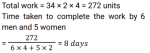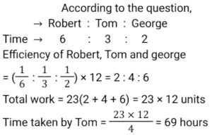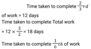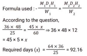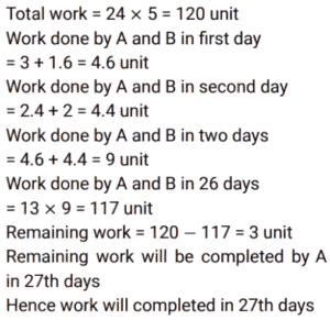 Work and Time (SSC) (Part-3)Total Questions: 5031. In an office, 75 employees can finish a project in 60 days. After few days, 15 employees left the job and the project was completed in 65 days. After how many days did the 15 employees leave ? [SSC CPO 04/10/2023 (2nd Shift)](a) 40(b) 50(c) 45(d) 30Correct Answer: (a) 40Solution:32. Akshita and Raina are typing a book, but have only one laptop to work upon. They decided that they will work on alternate basis such that Akshita works for the first day, Raina works for the second day, Akshita for the third day and so on. Akshita alone can finish the typing work in 16 days, while Raina will take 24 days if she works alone on the entire book. How many days will they take to finish the typing work if they work on alternate basis? [SSC CPO 04/10/2023 (2nd Shift)](a) 19(b) 15(c) 17(d) 18Correct Answer: (a) 19Solution:33. 36 equally efficient workers can paint 25 identical walls in 48 days. In how many days can 45 such workers paint 60 such walls ? [SSC CPO 04/10/2023 (3rd Shift)](a) 91.96(b) 92.16(c) 92.36(d) 91.16Correct Answer: (b) 92.16Solution:34. If 2 men or 4 women can build a wall in 34 days, in how many days can 6 men and 5 women build the same wall ? [SSC CPO 05/10/2023 (1st Shift)](a) 8(b) 16(c) 24(d) 12Correct Answer: (a) 8Solution: 35. A and B complete a work in 24 and 30 days, respectively, working 10 hours per day. The work is to be done in two shifts. The morning shift is for 6 hours and the evening shift is for 4 hours. On the first day, A works in the morning and B works in the evening, and they interchange their shifts every day. On which day did the work get completed. [SSC CPO 05/10/2023 (1st Shift)](a) 24th day(b) 27th day(c) 30th day(d) 21st dayCorrect Answer: (b) 27th daySolution: 36. Robert takes twice as much time as Tom and thrice as much time as George to complete a work. If working together, they can complete it in 23 hours, then find the time that Tom will take to complete the work. [SSC CPO 05/10/2023 (2nd Shift)](a) 39 hours(b) 46 hours(c) 69 hours(d) 11 hoursCorrect Answer: (c) 69 hoursSolution:37. A can do a certain piece of work in 2.4 times the number of days in which B and C together can do it. If A and B together can do the said piece of work in 27 days and C alone can do it in 75 days, then how many days will B take to do this piece of work alone? [SSC CPO 05/10/2023 (2nd Shift)](a) 42(b) 54(c) 48(d) 45Correct Answer: (d) 45Solution:38. If Arun can complete (2/3)ʳᵈ of a work in 12 days, then in how many days can he complete (1/6)ᵗʰ of the same work? [SSC CPO 05/10/2023 (3rd Shift)](a) 4(b) 5(c) 2(d) 3Correct Answer: (d) 3Solution: 39. A, B and C can do a piece of work in 10, 15, 12 days, respectively. A and B worked alternately for 5 days each and left. Then C joined and completed the work. In how many days did C complete the remaining work ? [SSC MTS 01/09/2023 (1st Shift)](a) 3(b) 1(c) 4(d) 2Correct Answer: (d) 2Solution:40. Ram can do a piece of work in 18 hours. Shyam and Naresh can do it in 9 hours. Ram and Naresh can do it in 12 hours. How long will Shyam alone take to do it ? [SSC MTS 01/09/2023 (2nd Shift)](a) 15 hours(b) 9 hours(c) 12 hours(d) 11 hoursCorrect Answer: (c) 12 hoursSolution:Submit Quiz« Previous12345Next »