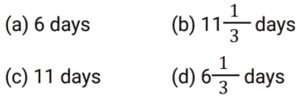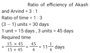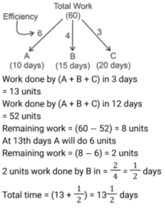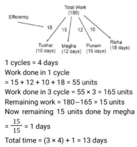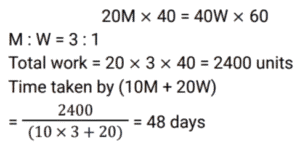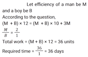 Work and Time (SSC) (Part-3)Total Questions: 5041. A and B can do a piece of work in 9 and 18 days, respectively. They started working together. After some days A left the work and B finished the remaining work in 15 days. After how many days did A leave ? [SSC MTS 01/09/2023 (3rd Shift)](a) 1(b) 2(c) 4(d) 3Correct Answer: (a) 1Solution:42. 20 men can complete a piece of work in 40 days, and 40 women can do the same work in 60 days. If 10 men and 20 women work together, then in how many days will the work be completed ? [SSC MTS 04/09/2023 (2nd Shift)](a) 60(b) 50(c) 48(d) 40Correct Answer: (c) 48Solution:43. A, B and C can complete a work in 10, 15 and 20 days, respectively. They work on alternate days such that 1ˢᵗ day A, 2ⁿᵈ day B and 3ʳᵈ day C. Again 4ᵗʰ day A, 5ᵗʰ day B and so on. If they work in the same way, in how many days will the work be completed? [SSC MTS 04/09/2023 (2nd Shift)](a)(b)(c)(d)Correct Answer: (d)Solution:44. If P can finish a job in 3 hours and Q can finish the same job in 6 hours independently, then they together will finish the job in 𝓍 minutes. Find the value of 𝓍. [SSC MTS 04/09/2023 (3rd Shift)](a) 160(b) 100(c) 150(d) 120Correct Answer: (d) 120Solution: 45. A man can finish a work in 12 days and a woman can finish the same in 10 days. 2 men and 3 women work on alternate days and men start the first day. The work will be finished in ________ days. [SSC MTS 04/09/2023 (3rd Shift)](a)(b)(c)(d)Correct Answer: (c)Solution:46. Akash is thrice as good a workman as Arvind and therefore is able to finish a job in 30 days less than Arvind. If they work together, in how many days can they finish the job ? [SSC MTS 05/09/2023 (1st Shift)](a)(b)(c)(d)Correct Answer: (a)Solution:47. Tushar, Megha, Punam and Richa can complete a piece of work in 10 days, 12 days, 15 days and 18 days, respectively. In how many days will the work be completed if each of them work on alternate days starting with Megha on first day, Punam on second day, Richa on third day, Tushar on fourth day and then again Megha on fifth day and so on. [SSC MTS 05/09/2023 (2nd Shift)](a) 12(b) 13(c) 10(d) 14Correct Answer: (b) 13Solution:48. A man and a boy can do a piece of work in 12 days . If the man works alone for the last 3 days, it is completed in 13 days. How long would the boy take to do it alone ? [SSC MTS 05/09/2023 (3rd Shift)](a) 36 day(b) 18 day(c) 72 day(d) 30 dayCorrect Answer: (a) 36 daySolution:49. X can type 8 pages in 3 minutes. Y can type 3 pages in 5 minutes. Working together, how many pages can they type in 15 minutes ? [SSC MTS 06/09/2023 (1st Shift)](a) 42(b) 40(c) 46(d) 49Correct Answer: (d) 49Solution:50. A and B can finish a work in 5⅓ days. A alone can finish this work in 8 days. A and B worked on alternate days (starting with B) to finish this work. In how many days will the work be finished? [SSC MTS 06/09/2023 (2nd Shift)](a)(b)(c)(d)Correct Answer: (c)Solution:Submit Quiz« Previous12345