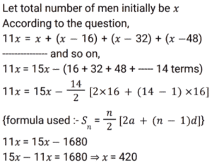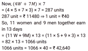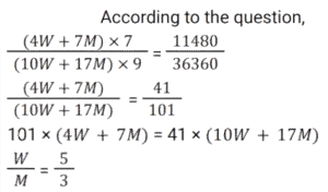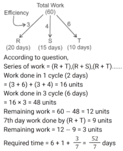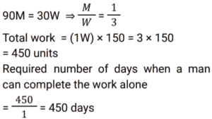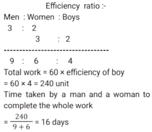 Work and Time (SSC) (Part-5)Total Questions: 501. A can do a certain piece of work in 1.5 times the number of days in which B and C together can do it. If A and B together can do the said piece of work in 30 days and C alone can do it in 120 days, then how many days will B take to do this piece of work alone? [SSC CGL 24/07/2023 (2nd shift)](a) 75(b) 45(c) 60(d) 50Correct Answer: (c) 60Solution: 2. 4 women and 7 men earn a total of ₹11,480 in 7 days, while 10 women and 17 men earn a total of 36,360 in 9 days. How much will 11 women and 9 men together earn (in ₹) in 13 days ? [SSC CGL 24/07/2023 (3rd shift)](a) 42770(b) 42640(c) 42510(d) 42900Correct Answer: (b) 42640Solution: 3. 6 labourers can finish a work in 16 days. 10 labourers are available, but the work is to be finished by 8 days. How many more labourers are to be called to finish the work in time ? [SSC CGL 24/07/2023 (4th shift)](a) 2(b) 0(c) 4(d) 1Correct Answer: (a) 2Solution:4. R, S and T can finish a work in 20, 15 and 10 days, respectively. R works on all days and S and T work on alternate days with T starting the work on the first day. In how many days is the work finished? [SSC CGL 24/07/2023 (4th shift)](a)(b)(c)(d)Correct Answer: (c)Solution:5. P and Q together complete a job in 4⅖ days. R and S complete the same job in 4⁸⁄₉ days. If P, Q, R and S work together, how many days do they need to complete the same job ? [SSC CGL 25/07/2023 (2nd shift)](a)(b)(c)(d)Correct Answer: (d)Solution:6. A group of college students had decided to complete a project in 10 days. As 2 students dropped out every day, the project got completed at the end of the 15th day. The number of students at the beginning of the project was: [SSC CGL 25/07/2023 (4th shift)](a) 42(b) 40(c) 35(d) 45Correct Answer: (a) 42Solution:7. 20 women and 15 men together can complete a work in 6 days. It takes 150 days for a single woman to complete the same work. In how many days can a single man complete the work ? [SSC CGL 25/07/2023 (4th shift)](a) 450(b) 225(c) 350(d) 210Correct Answer: (a) 450Solution: 8. 4 men's work is equal to 6 women's work, and 4 women's work is equal to 6 boys' work. A boy can finish the work in 60 days. In how many days can the work be finished by a man and a woman together ? [SSC CGL 26/07/2023 (1st shift)](a) 16(b) 24(c) 20(d) 12Correct Answer: (a) 16Solution:9. A group of men decided to do a job in 11 days but 16 men left the work after each day. The work, as a result, got completed in 15 days. How many men were there initially in the group? [SSC CGL 26/07/2023 (1st shift)](a) 400(b) 480(c) 420(d) 450Correct Answer: (c) 420Solution:10. 15 men complete a work in 10 days. 15 women complete the same work in 12 days. If all these men and women work together, then the number of days required to complete that work is: [SSC CGL 26/07/2023 (4th shift)](a)(b)(c)(d)Correct Answer: (a)Solution:Submit Quiz12345Next »