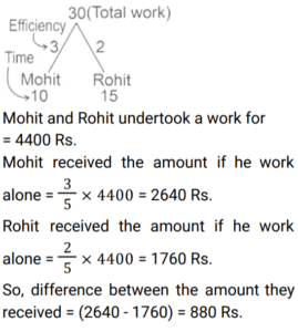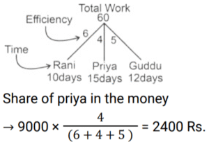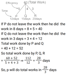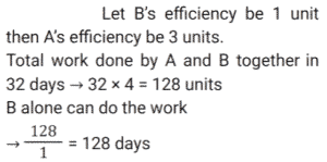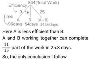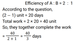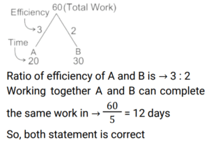 Work and Time (SSC) (Part-5)Total Questions: 5031. Shreyas can complete 4/5 part of a work in 16 days. Ruchi is 2.5 times as efficient as Shreyas. In how many days will Ruchi alone can complete the same work ? [SSC MTS 19/06/2023 (Morning)](a) 9 days(b) 12.5 days(c) 10 days(d) 8 daysCorrect Answer: (d) 8 daysSolution:32. A is two times as efficient as B. A can complete a work in 20 days less than B. If both of them work together, then in how many days will the same work be completed ? [SSC MTS 20/06/2023 (Afternoon)](a)(b)(c)(d)Correct Answer: (a)Solution:33. Mohit and Rohit undertook a work for Rs. 4400. Mohit alone can do that work in 10 days and Rohit alone can do the same work in 15 days. If they work together, then what will be the difference in the amount they receive ? [SSC CHSL 09/03/2023 (4th Shift)](a) Rs. 800(b) Rs. 1050(c) Rs. 900(d) Rs. 880Correct Answer: (d) Rs. 880Solution:34. If A alone can complete a work in 20 days and B alone can complete the same work in 30 days, then which of the following statement(s) is/are correct ? I. Ratio of efficiency of A and B is 3 : 2. II.Working together A and B can complete the same work in 12 days. [SSC CHSL 10/03/2023 (2nd Shift)](a) Neither I nor II(b) Both I and II(c) Only(d) Only ICorrect Answer: (b) Both I and IISolution:35. A is thrice as good a workman as B and together they can finish a work in 32 days. In how many days will B alone complete the same work ? [SSC CHSL 14/03/2023 (4th Shift)](a) 96(b) 104(c) 112(d) 128Correct Answer: (d) 128Solution:36. P, Q and R can complete a work alone in 12, 15 and 20 days respectively. They started the work together. P left the work 8 days before the work was completed and Q left the work 5 days after P had left. R completed the remaining work alone. How many days will be required to complete the whole work? [SSC CHSL 15/03/2023 (4th Shift)](a)(b)(c)(d)Correct Answer: (c)Solution:37. Rani can do a work in 10 days, Priya can do the same work in 15 days and Guddu can do the same work in 12 days. If they do that work together and they are paid Rs. 9000, then what is the share of Priya ? [SSC CHSL 17/03/2023 (2nd Shift)](a) Rs.2400(b) Rs.3000(c) Rs.3500(d) Rs.3600Correct Answer: (a) Rs.2400Solution:38. A certain number of persons can complete a work in 90 days. If there be 10 persons less, it would have taken 10 days more for the work to be completed. Find the total number of persons in the beginning. [SSC CHSL 20/03/2023 (1st Shift)](a) 90(b) 110(c) 85(d) 100Correct Answer: (d) 100Solution:39. A alone can complete a work in 20 days with full efficiency. If the efficiency of A decreases by 20 percent. then A alone can do the same work in how many days? [SSC CHSL 20/03/2023 (4th Shift)](a) 30(b) 20(c) 25(d) 36Correct Answer: (c) 25Solution:40. A can complete 3/8 part of a work in 36 days. B can complete 1/2 part of the same work in 27 days. Which of the following statements(s) is/are correct ? [SSC CHSL 21/03/2023 (1st Shift)]I. A is less efficient than B.II. A and B working together can complete11/15 part of the same work in 36 days.(a) Neither I nor II(b) Only I(c) Only II(d) Both I and IICorrect Answer: (b) Only ISolution: Submit Quiz« Previous12345Next »