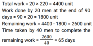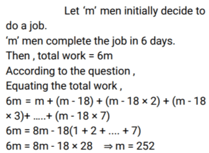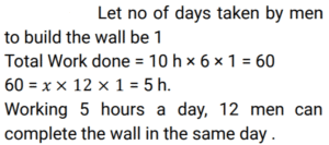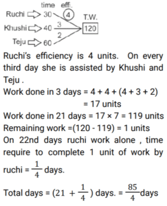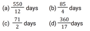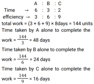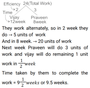 Work and Time (SSC) (Part-5)Total Questions: 5041. Working for 10 hours per day, 6 men can build a wall in a certain number of days. By working for how many hours/minutes per day can 12 men build the wall in the same days? [SSC CGL Tier II (07/03/2023)](a) 7 hours 30 minutes(b) 5 hours(c) 20 hours(d) 10 hoursCorrect Answer: (b) 5 hoursSolution:42. A takes 4 times as much times as B or 5 times as much time as C to finish a piece of work. Working together, they can finish the work in 4 days. B can do the work alone in: [SSC CGL 01/12/2022 (3rd Shift)](a) 10 days(b) 15 days(c) 12 days(d) 20 daysCorrect Answer: (a) 10 daysSolution:43. A takes twice as much time as B and thrice as much time as C to finalise a task. Working together, they can complete the task in 8 days. The time (in days) taken by A, B and C, respectively, to complete the task is: [SSC CGL 02/12/2022 (2nd Shift)](a) 42, 21, 14(b) 60, 30, 20(c) 54, 27, 18(d) 48, 24, 16Correct Answer: (d) 48, 24, 16Solution:44. Ruchi, Khushi and Teju can do a piece of work in 30, 40 and 60 days respectively. In how many days can Ruchi do the work, if she is assisted by both Khushi and Teju on every third day? [SSC CGL 03/12/2022 (1st Shift)] (a)(b)(c)(d)Correct Answer: (b)Solution:45. A contractor decided to complete a work in 80 days and employed 60 men at the beginning and 20 men additionally after 20 days and got the work completed as per schedule. If he had not employed the additional men, how many extra days would he have needed to complete the work (round off to the nearest integer)? [SSC CGL 05/12/2022 (2nd Shift)](a) 3(b) 20(c) 30(d) 26Correct Answer: (b) 20Solution: 46. A group of men decided to do a job in 6 days, but 18 men dropped out every day. If the job was completed in 8 days, then how many men initially decided to do the job. [SSC CGL 06/12/2022 (2nd Shift)](a) 300(b) 252(c) 188(d) 150Correct Answer: (b) 252Solution:47. In a partnership firm two partners, Vijay and Praveen are working on an assignment. It will take 12 weeks for Vijay to complete the entire assignment alone, while Praveen will take 8 weeks to complete it alone. Due to work pressure, they decided to work on that assignment on the alternate week basis. In the first week Praveen will work and in the second week Vijay will work and so on. In how many weeks the work will be completed if they work on an alternate week basis? [SSC CGL 07/12/2022 (2nd Shift)](a) 8(b) 8.5(c) 9.5(d) 9Correct Answer: (c) 9.5Solution:48. 20 men can finish a work in 220 days, but at the end of 90 days, 20 additional men are employed. In how many more days will the work be completed? [SSC CGL 09/12/2022 (2nd Shift)](a) 50(b) 60(c) 65(d) 55Correct Answer: (c) 65Solution:49. Abha and Anuj working together completed a job in 40/9 days. If Abha had worked twice as efficiently as she actually did and Anuj had worked 1/3 of his actual efficiency, then the work would have been completed in 60/17 days. Find the time Abha would take to complete the work alone. [SSC CGL 09/12/2022 (3rd Shift)](a) 10 days(b) 8 days(c) 12 days(d) 6 daysCorrect Answer: (b) 8 daysSolution:50. Two persons A and B working separately can sanitise a building in 6 and 10 hours, respectively. They work in stretches of one hour alternately. If A begins at 8 a.m., then when will the work be finished ? [SSC CGL 13/12/2022 (3rd Shift)](a)(b)(c)(d)Correct Answer: (b)Solution:Submit Quiz« Previous12345