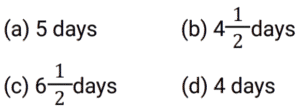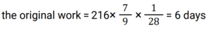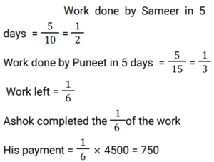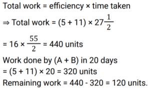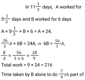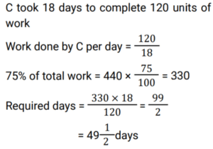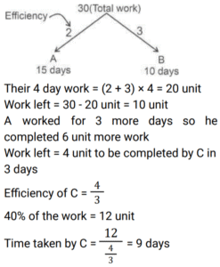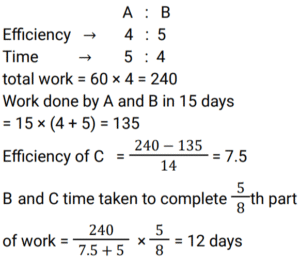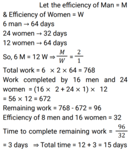 Work and Time (SSC) (Part-6)Total Questions: 4931. 6 men can do a work in 64 days, and 24 women can do the same work in 32 days. 16 men and 24 women together do this work for 12 days after that 8 men and 8 women leave the work. Find total days to complete the whole work? [SSC MTS 20/10/2021 (Morning)](a) 18(b) 6(c) 3(d) 15Correct Answer: (d) 15Solution:32. To do a certain work, the ratio of the efficiencies of A and B is 5 : 11. Working together, they can do the same work in 27½ days. A and B work together for 20 days. C alone completes the remaining work in 18 days. C alone can do 75% of the original work in: [SSC MTS 20/10/2021 (Evening)](a)(b)(c)(d)Correct Answer: (d)Solution: 33. X can do a certain work in 40 hours. Y is 25% more efficient than X, and Z is 28% more efficient than Y. Working together, X,Y and Z will complete the same work in: [SSC MTS 26/10/2021 (Afternoon)](a)(b)(c)(d)Correct Answer: (a)Solution:34. X and Y can complete a certain work in 16 days and 24 days, respectively. They work together for 4 days. Z alone completes the remaining work in 10½ days. Y and Z together can complete 7/8 th part odf the same work in: [SSC MTS 27/10/2021 (Afternoon)](a) 10 days(b) 8 days(c) 9 days(d) 12 daysCorrect Answer: (c) 9 daysSolution:35. Y takes five days more than X to finish a work. Working together, they finish the work in six days. In how many days can Y finish it working alone ? [SSC MTS 02/11/2021 (Evening)](a) 16(b) 12(c) 15(d) 10Correct Answer: (c) 15Solution:36. To do a certain work. A and B work on alternate days with B beginning the work on the first day. A Alone can complete the same work in 24 days. If the work gets completed in 11⅓ days, then B can complete 7/9 th part of the original work in: [SSC CGL 13/08/2021 (Morning)](a)(b)(c)(d)Correct Answer: (d)Solution: 37. A can do a certain work in 15 days. B is 25% more efficient than A. Both worked together for 4 days. C alone completed the remaining work in 8 days. A, B and C together will complete the same work in ? [SSC CGL 16/08/2021 (Morning)](a)(b)(c)(d)Correct Answer: (a)Solution:38. A and B can complete a work in 15 days and 10 days respectively. They started doing the work together but after 4 days B had to leave. Then A working with a new worker C completed the remaining work in 3 days. If C works alone, in how many days he can do 40% of the same work ? [SSC CGL 16/08/2021 (Afternoon)](a)(b)(c)(d)Correct Answer: (a)Solution:39. Samir and Puneet can complete the same work in 10 days and 15 days respectively. The work was assigned for Rs.4500. After working together for 3 days Samir and Puneet involved Ashok. The work was completed in total 5 days. What amount (in Rs.) was paid to Ashok? [SSC CGL 16/08/2021 (Evening)](a) 750(b) 1500(c) 1071(d) 800Correct Answer: (a) 750Solution:40. A can complete a work in 60 days, B is 25% more efficient than A. They work together for 15 days. C alone completes the remaining work in 14 days, B and C together will complete 5/8 th part of the original work in: [SSC CGL 18/08/2021 (Afternoon)](a) 18 days(b) 16 days(c) 12 days(d) 15 daysCorrect Answer: (c) 12 daysSolution:Submit Quiz« Previous12345Next »