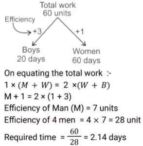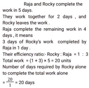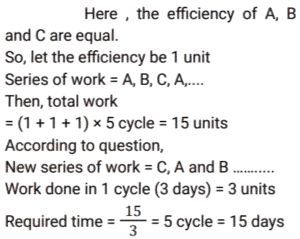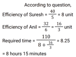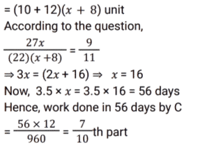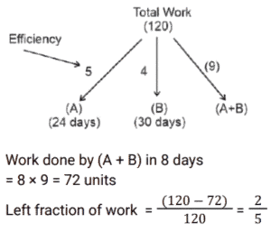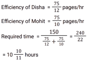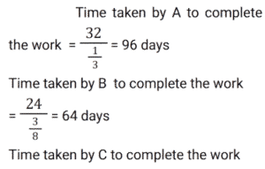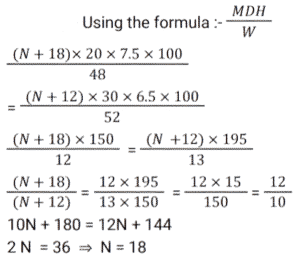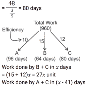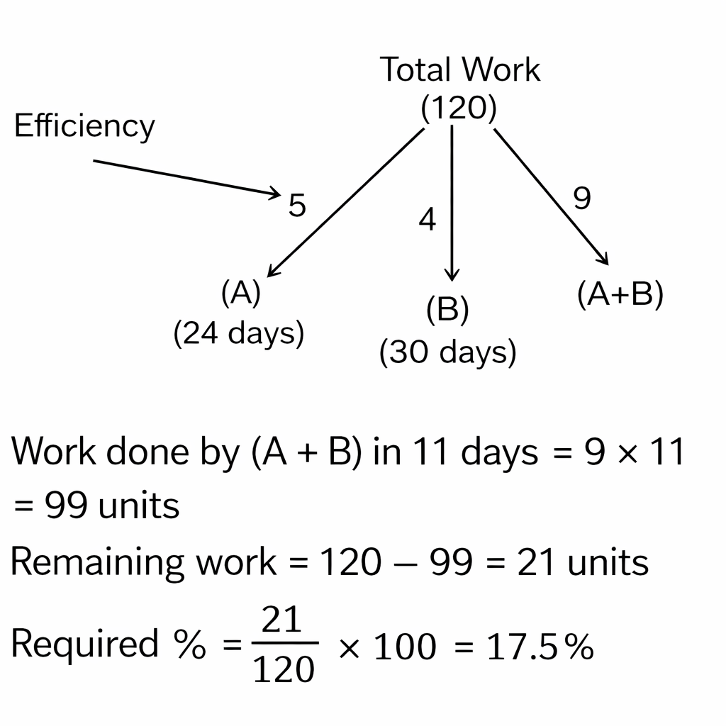 Work and Time (SSC)Total Questions: 5011. A can finish a work in 24 days and B in 30 days, individually. They work together for 11 days. The percentage of the work still to be finished will be: [SSC CHSL 10/08/2023 (4th Shift)](a) 18%(b) 16%(c) 17.5%(d) 12.5%Correct Answer: (c) 17.5%Solution:12. In an army camp, there is food provision for 500 cadets for 25 days. If 125 more persons join the army camp on the first day itself, then for how many days will the provision last ? [SSC CHSL 08/08/2023 (3rd Shift)](a) 20(b) 15(c) 10(d) 25Correct Answer: (a) 20Solution:13. A can do a piece of work in 24 days and B can do the same work in 30 days. If they work on it together for 8 days, then the fraction of the work that is left is: [SSC CHSL 04/08/2023 (4th Shift)](a)(b)(c)(d)Correct Answer: (b)Solution:14. Disha takes 12 hours to copy a 75 - page manuscript, while Mohit can copy the same manuscript in 10 hours. How many hours will it take for them to copy a 150 - page manuscript if they work together? [SSC CHSL 03/08/2023 (4th Shift)](a)(b)(c)(d)Correct Answer: (a)Solution:15. A man and a woman can finish a work together in half the time taken by a woman and a boy together. A boy can finish the work alone in 20 days and 2 women together can finish it in 30 days. In how many days will the work be finished by 4 men ? [SSC CGL 18/07/2023 (4th shift)](a) 2(b) 2.14(c) 2.5(d) 3Correct Answer: (b) 2.14Solution:16. A, B and C can finish a work in 15 days working alternately in the same order. The efficiency of A is the same as that of B, and the efficiency of C is equal to that of A. In how many days will the work be finished if they work alternately in the order C, A and B ? [SSC CGL 26/07/2023 (3rd shift)](a) 12(b) 14(c) 15(d) 16Correct Answer: (c) 15Solution:17. A can do 1/3 of a piece of work in 32 days, B can do 37½% of the same work in 24 days, while C can do 60% of the same work in 48 days. B and C together started and worked for x days. After x days, B left the work and A joined C and both completed the remaining work in (x + 8) days. If the ratio of the work done by (B + C) together to the work done by (A + C) together is 9 : 11, then what fraction of the same work can be completed by C alone in 3.5 x days ? [SSC CGL 25/07/2023 (2nd shift)](a)(b)(c)(d)Correct Answer: (c)Solution: 18. (N + 18) persons, each working for 7.5 hours a day, can complete 48% of a work in 20 days. (N + 12) persons can complete the remaining work in 30 days, if each of them works for 6.5 hours per day. Determine the value of N. [SSC CGL 19/07/2023 (1st shift)](a) 18(b) 16(c) 20(d) 22Correct Answer: (a) 18Solution:19. Suresh and Anil are working on a special project. Suresh takes 5 hours to type 40 pages and Anil needs 6 hours to type 32 pages on a computer. How much time will it take them to type a 110-page assignment if they work on two different computers ? [SSC CGL 18/07/2023 (4th shift)](a) 8 hours 15 minutes(b) 8 hours(c) 7 hours 35 minutes(d) 8 hours 40 minutesCorrect Answer: (a) 8 hours 15 minutesSolution:20. Raja and Rocky together can complete painting work in 5 days. Together they both start painting, but after 2 days, Rocky falls sick and leaves the work. If Raja completes the remaining painting in 4 days, find the number of days in which Rocky alone can do the work. [SSC CGL 18/07/2023 (2nd shift)](a) 12(b) 15(c) 20(d) 10Correct Answer: (c) 20Solution:Submit Quiz« Previous12345Next »