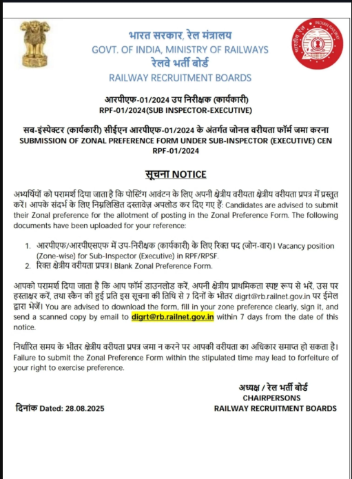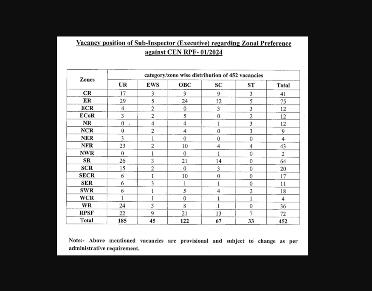 RPF Sub-Inspector (Executive) Vacancy Distribution Zone-wise and Category-wise (CEN RPF-01/2024)