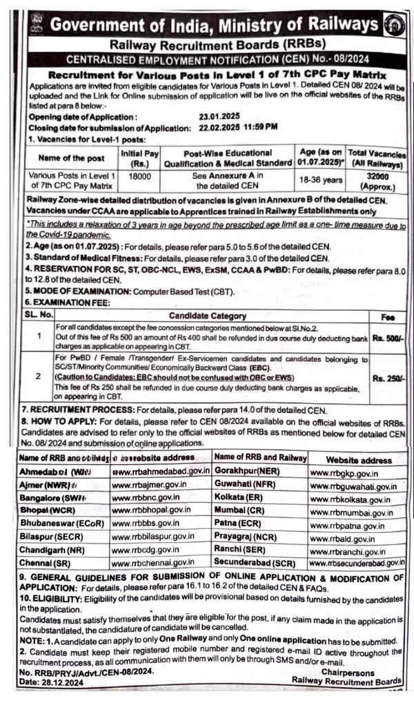 There are a total of 32,438 vacancies under Group D posts. Here are some key posts and their eligibility: