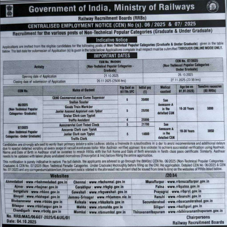 The Ministry of Railways has released the RRB NTPC Graduate Level Posts Notification 2026 for 5817 vacancies across India. These jobs are for graduates in posts like Station Master, Ticket Supervisor, Typist, Clerk, and more. The online application process started on 21st October 2025, and the last date to apply is 20th November 2025.